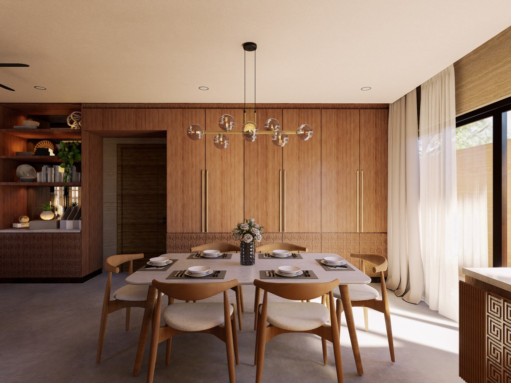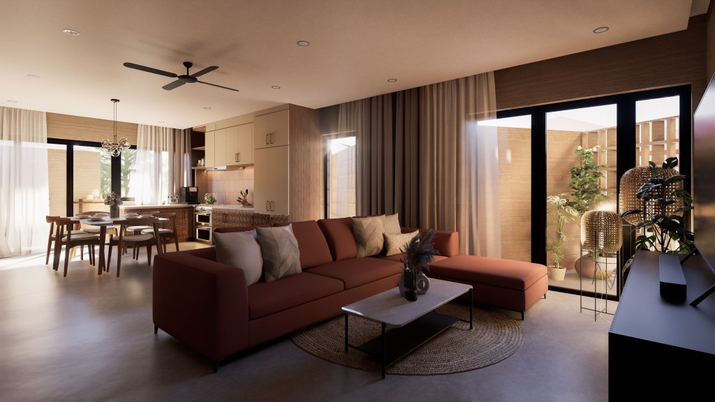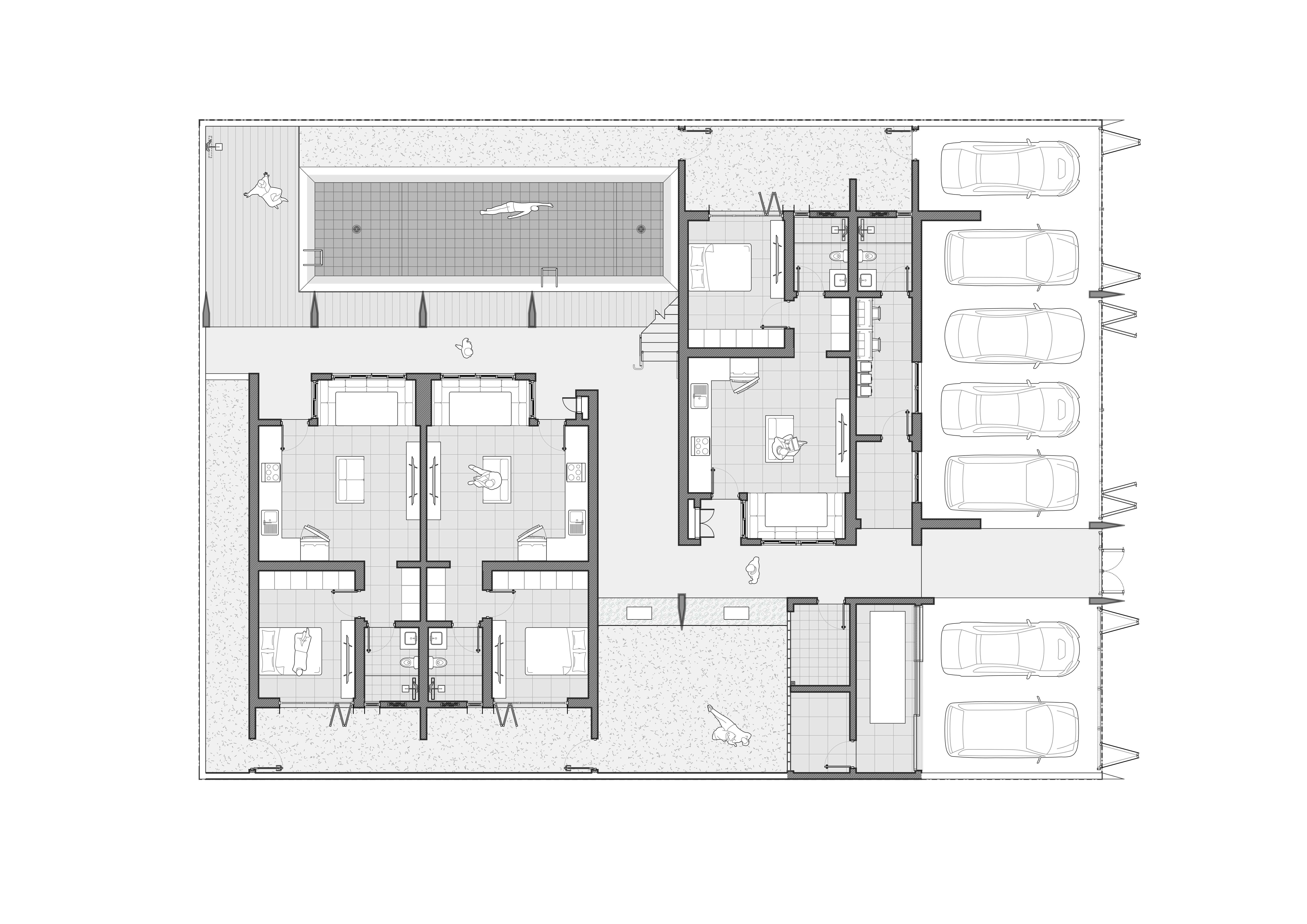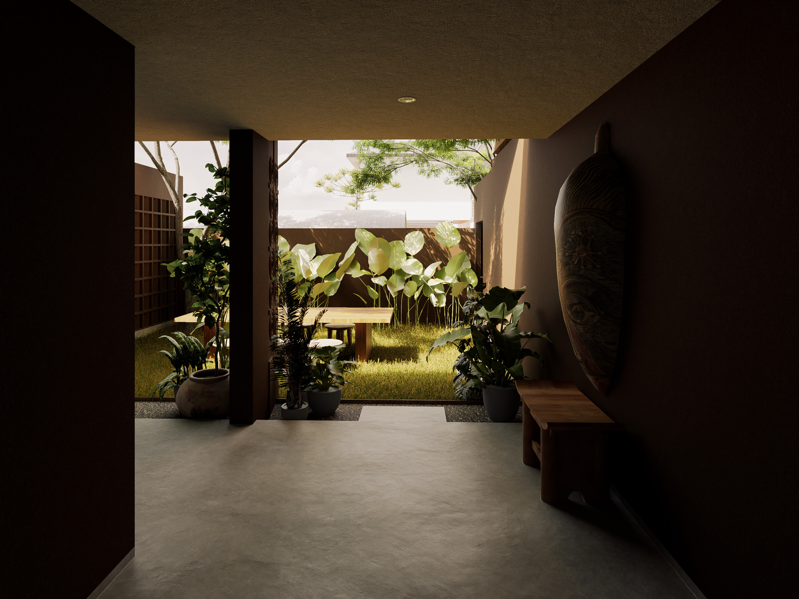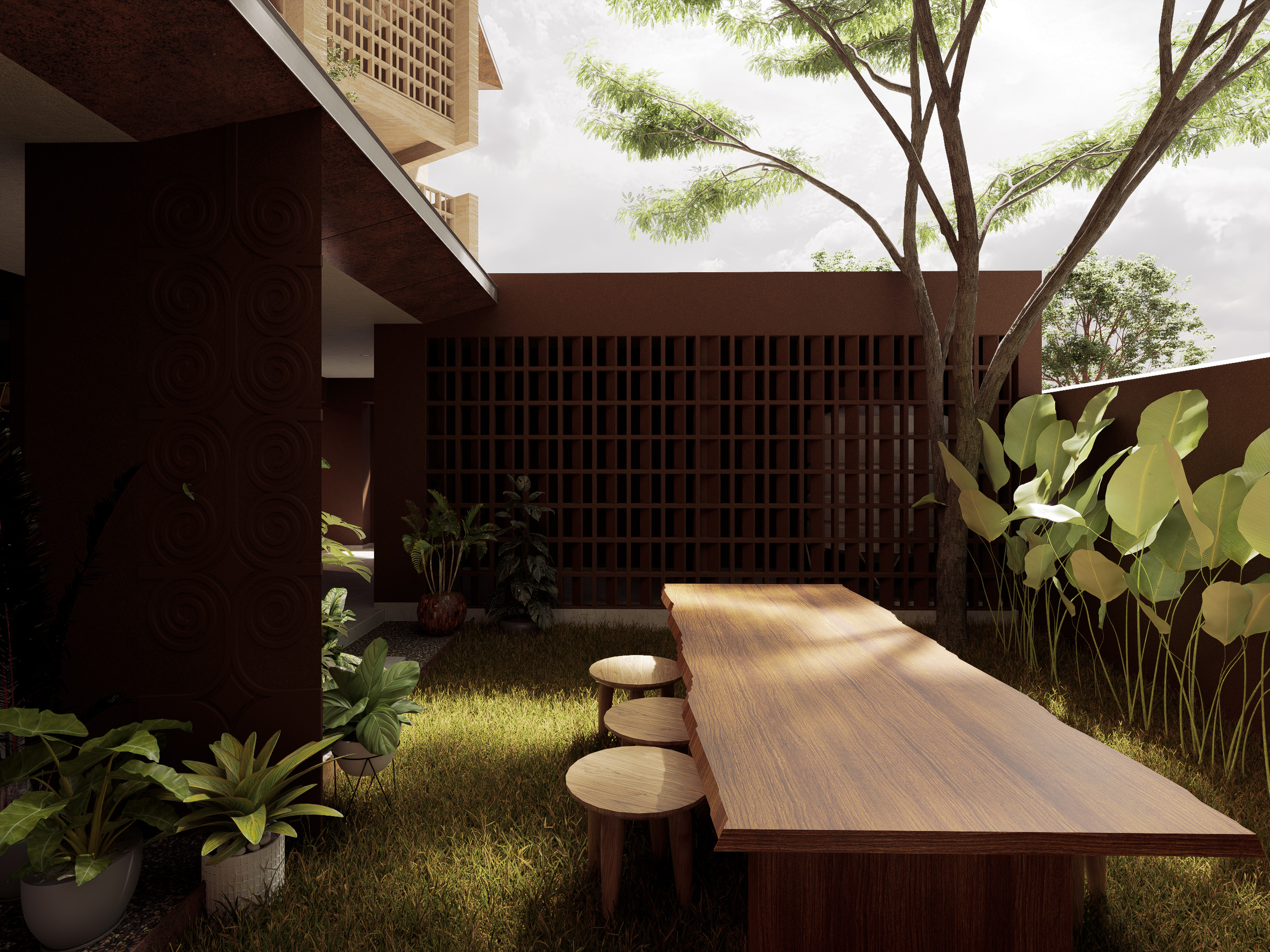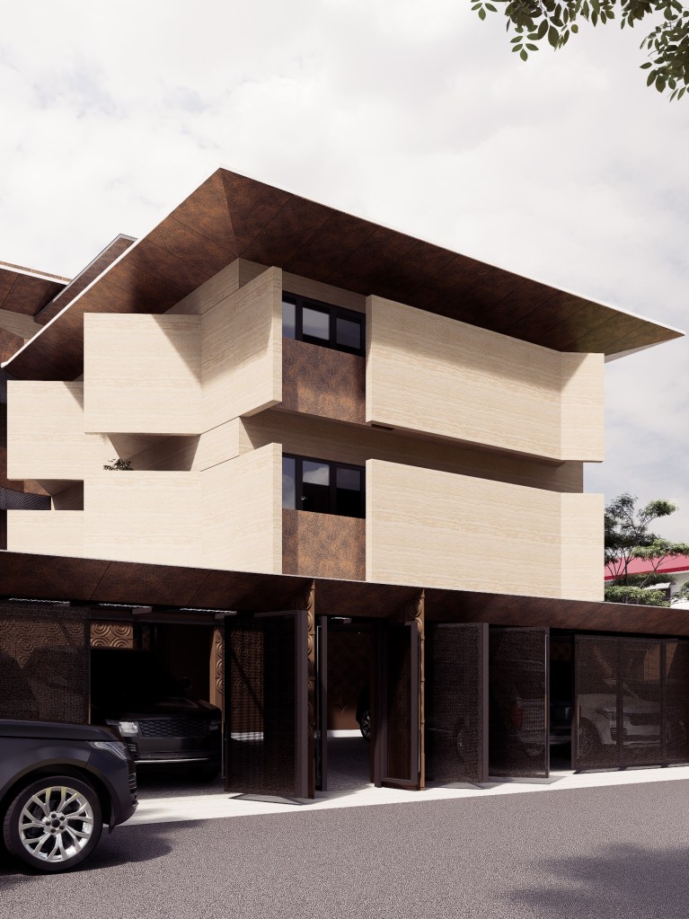 Service and utility spaces are positioned at the front of the building, separated from the main living areas to ensure privacy and provide convenient access for maintenance. The security and administration offices are located behind the car park, maintaining functional proximity while remaining discreet. The generator, electrical room, pump room, and tool room are housed within a separate building mass. The generator is accessible through the garage, while the remaining service rooms face the garden and are visually concealed with breeze blocks, allowing ventilation while maintaining aesthetic harmony.