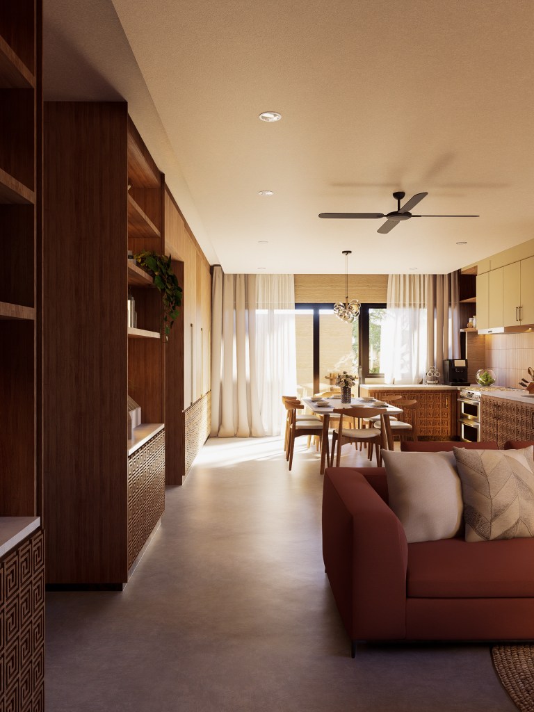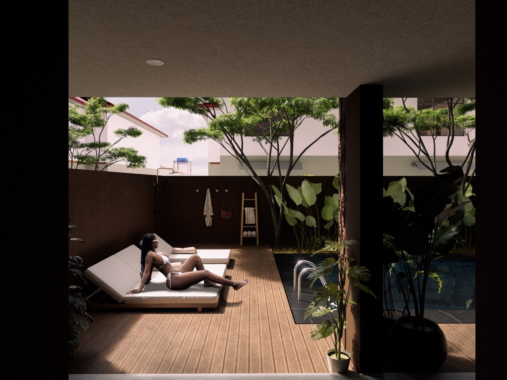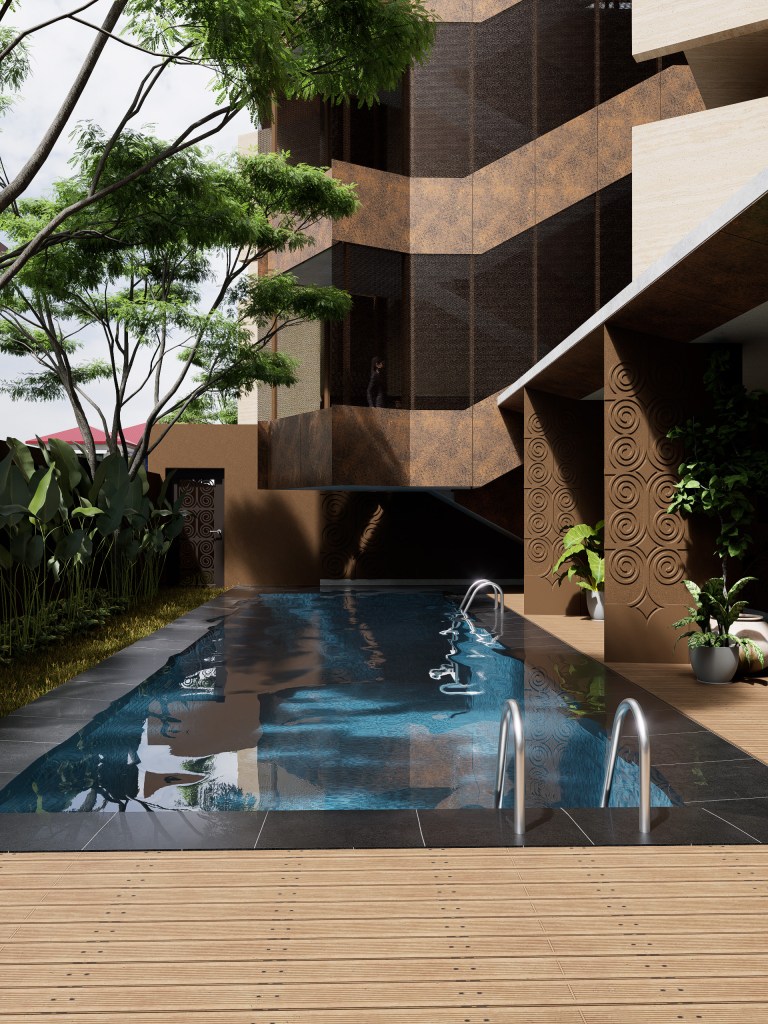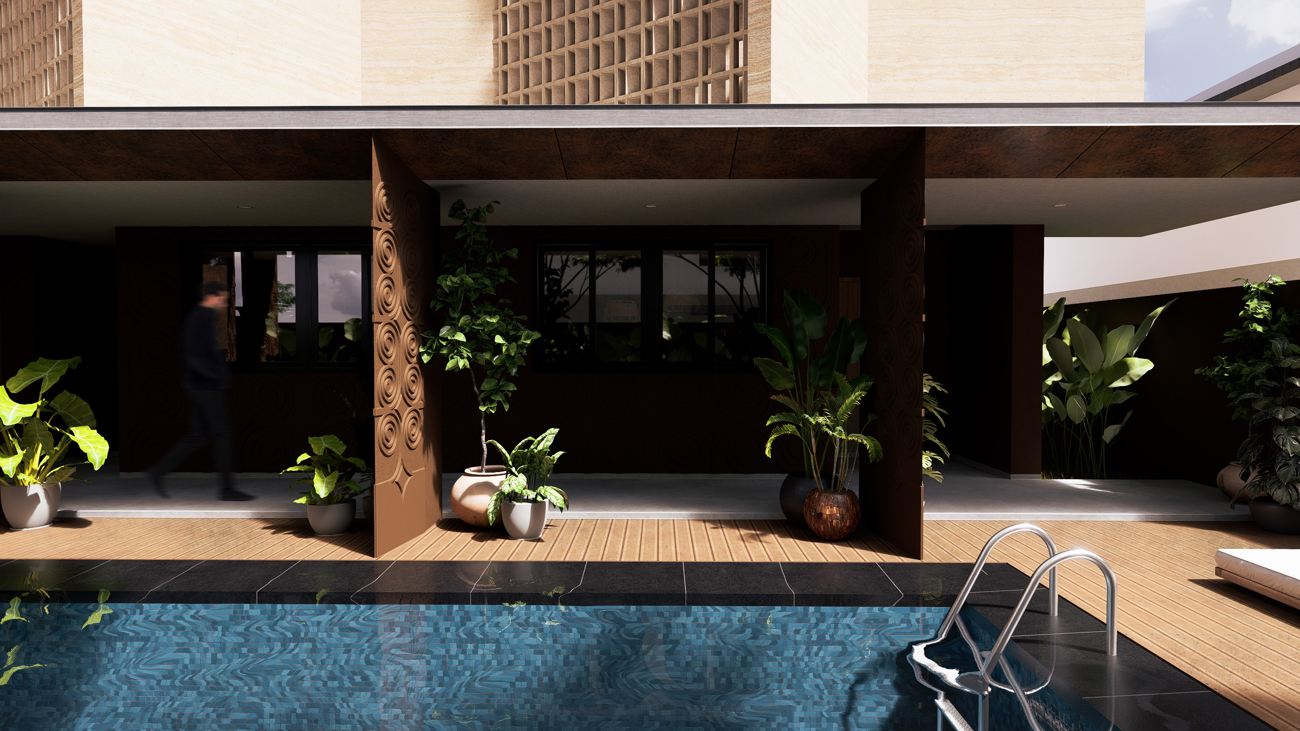 On the western side, a swimming pool runs along the hallway, introducing a calm and cooling atmosphere. Above it, a floating staircase extends across the space, serving as a striking visual centerpiece. The stair’s light structural frame casts soft reflections onto the water below, while the shimmering surface animates the underside of the steps with shifting patterns of light. As the afternoon sun reaches this side, the interaction between the pool and the staircase creates a dynamic play of light and shadow, enriching the space with a tranquil yet expressive character.