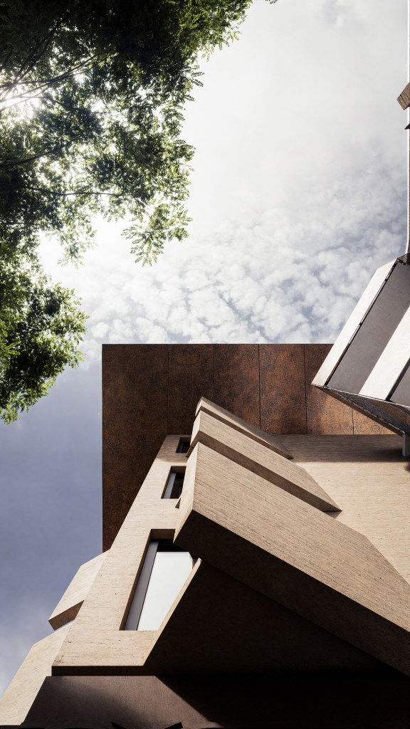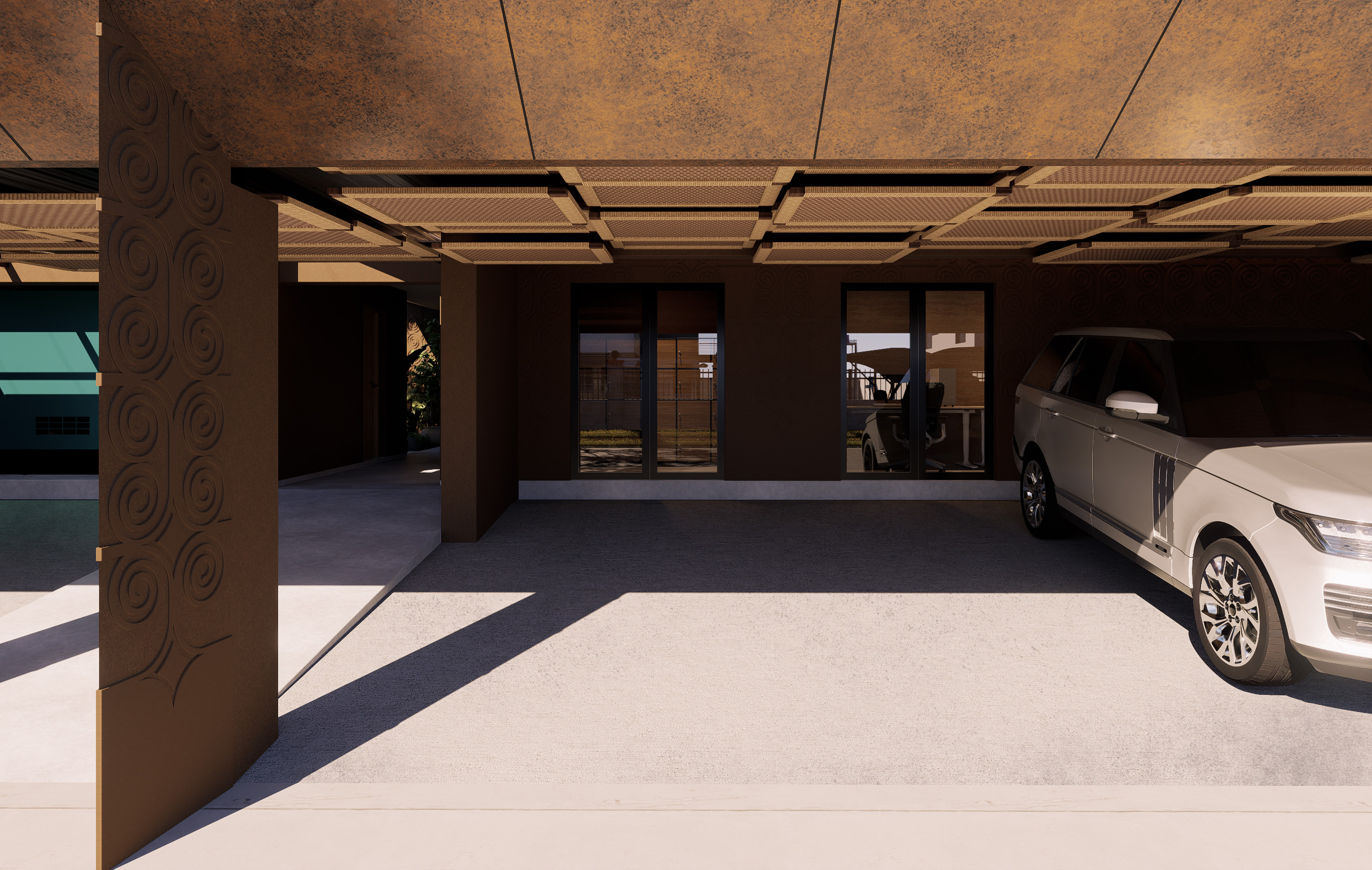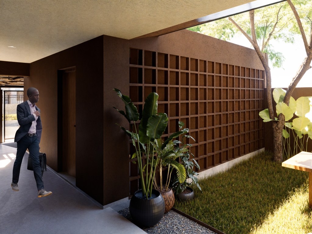 The car park spans across the front of the building, providing space for seven vehicles. It is fully enclosed with perforated fencing, ensuring both ventilation and security. The walls and columns are adorned with Adinkra symbols, celebrating Ghanaian cultural identity, while the canopy roof features woven ceiling panels that help reduce heat and add a tactile layer of craftsmanship. The building’s entrance adopts the same design language as the fence, creating a coherent and unified appearance. From the entrance, a hallway leads toward a central garden, which connects directly to the main staircase positioned at the heart of the building.