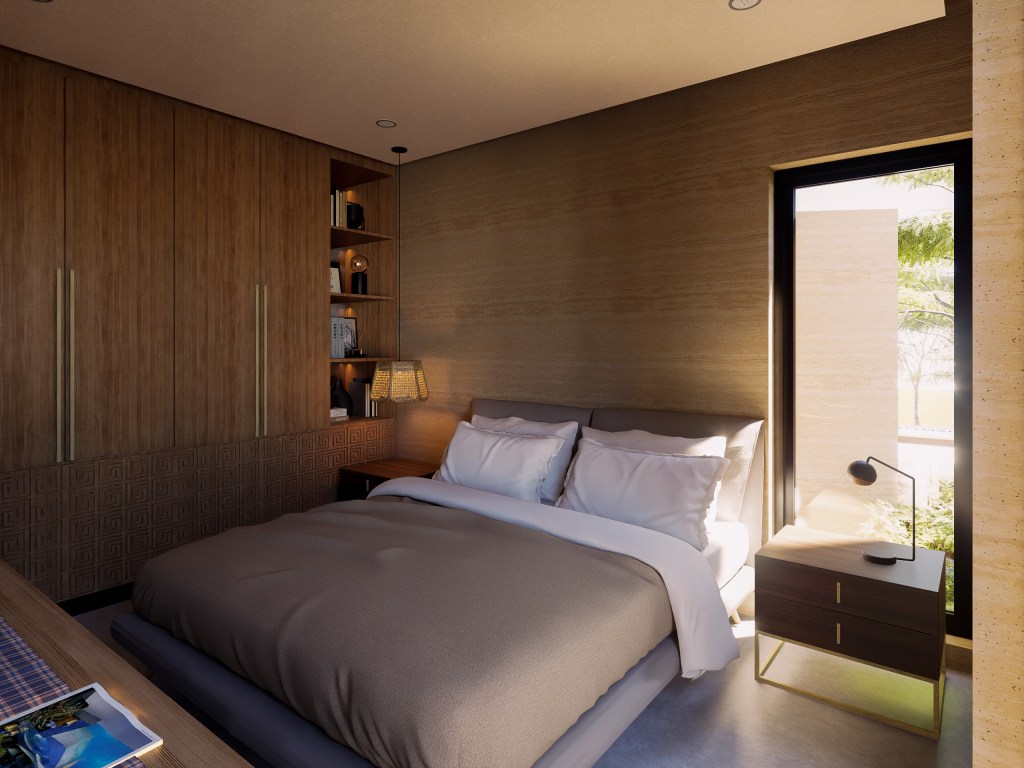 The building accommodates three compact one-bedroom units. One unit faces the eastern garden, while the other two overlook the western reflecting pool. Each unit includes a kitchen, living area, and dining nook—designed for efficient yet comfortable daily living. Both the bedroom and bathroom of each unit open toward a private garden view, oriented away from communal zones to maintain privacy and a close connection with nature.