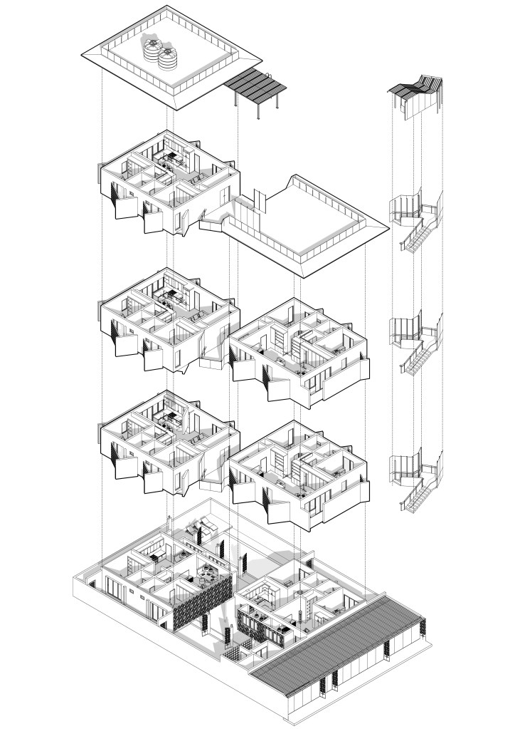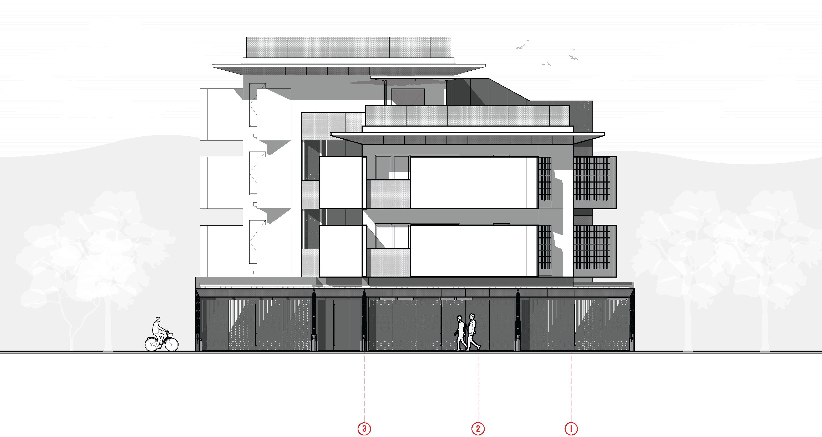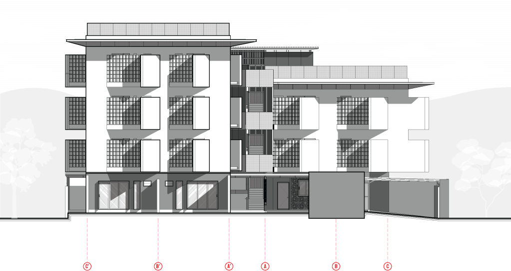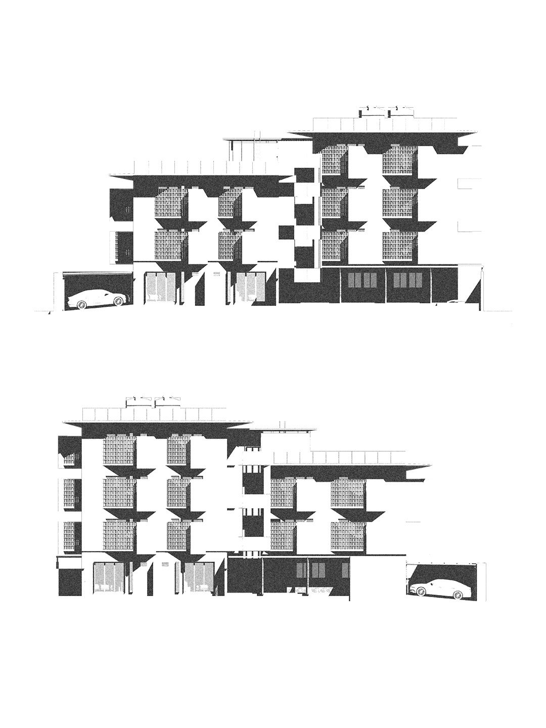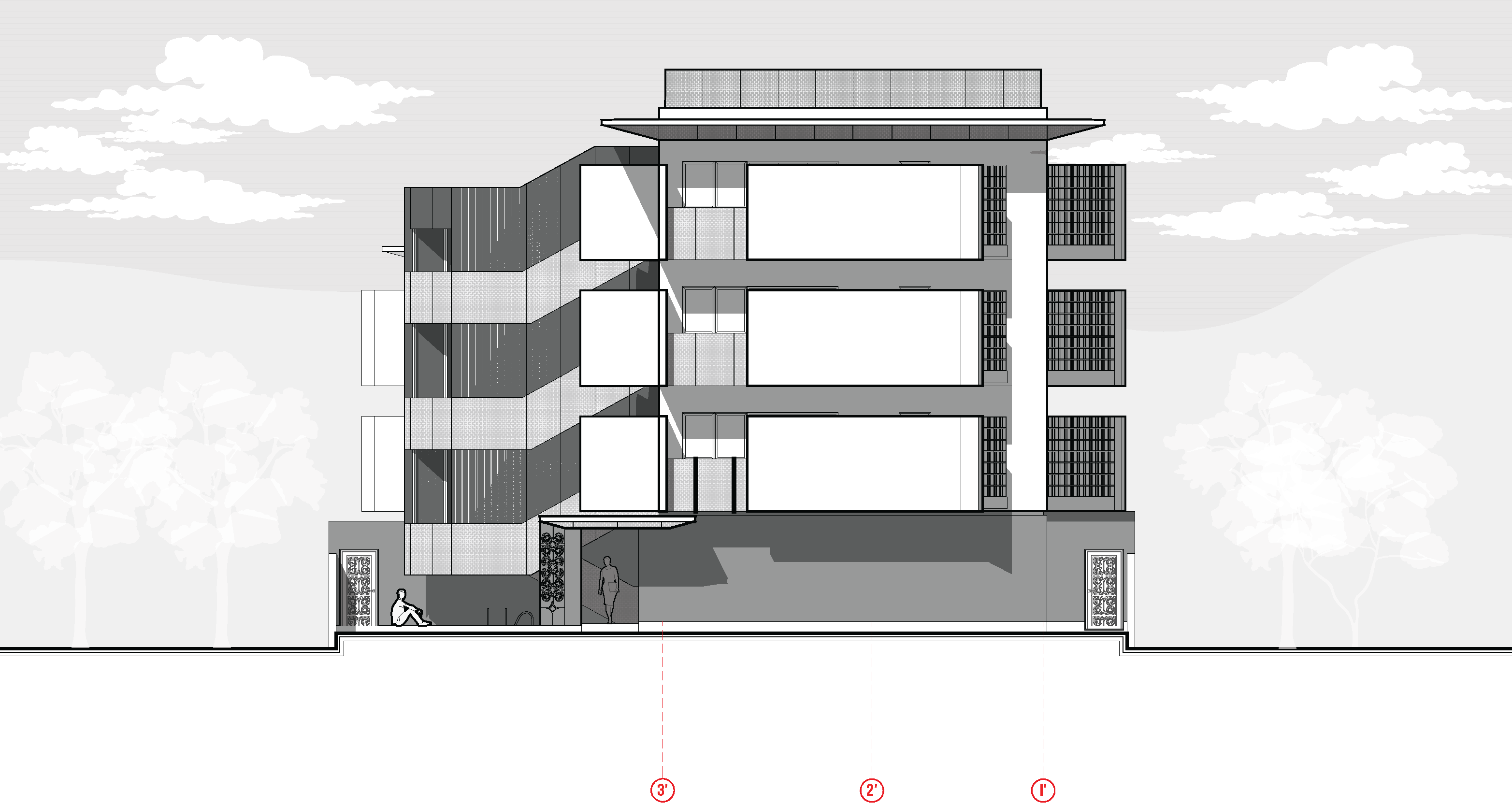 The site for this project is relatively compact compared to the intended building program. Although the floor plan shares similarities with common apartment layouts found in Ghana, our goal was to achieve a distinct architectural expression. The combination of shading elements and the typical floor plan generates a rhythmic repetition across the façade. These shaded forms not only cast dynamic shadows but also give the building an expressive identity beyond a simple rectangular mass. While solid walls on one side block direct sunlight, the porous breeze blocks on the other allow natural ventilation and continuous airflow throughout the building.