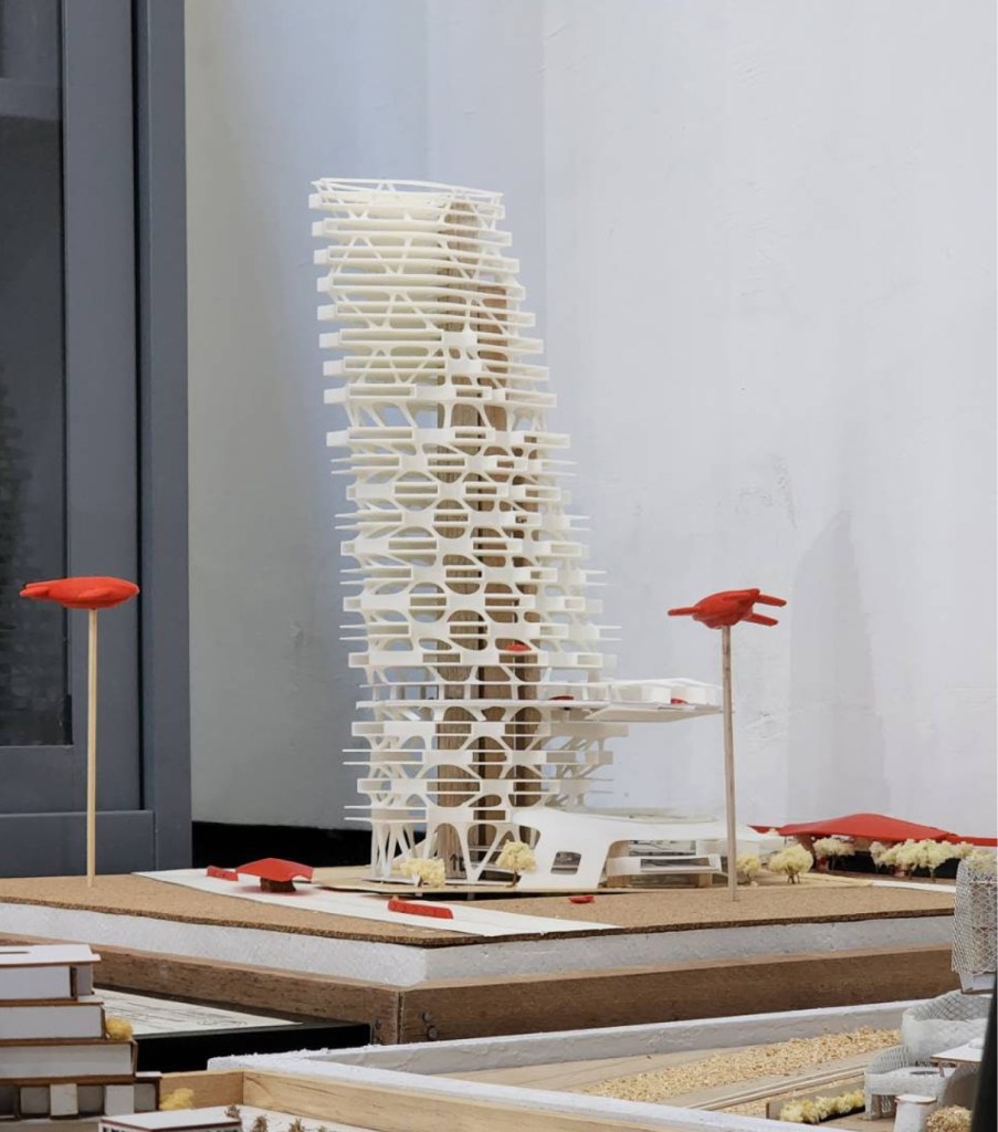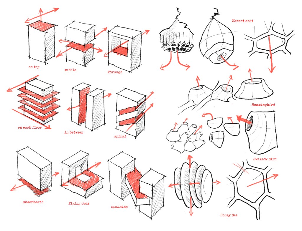 As inspiration, the design adopts forms from the dwellings of creatures with similar movement patterns, such as wasps, honeybees, swallows, and hummingbirds. The way these animals interact with their nests influences the massing exploration of the building. Concepts include landing pads on rooftops, penetration openings for access like beehives, decks attached to the core like swallow nests, and decks spanning between structures like hummingbird nests.