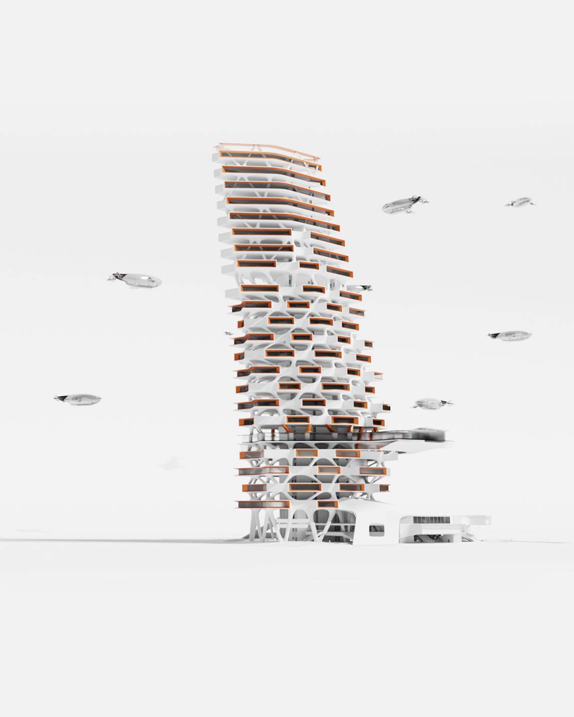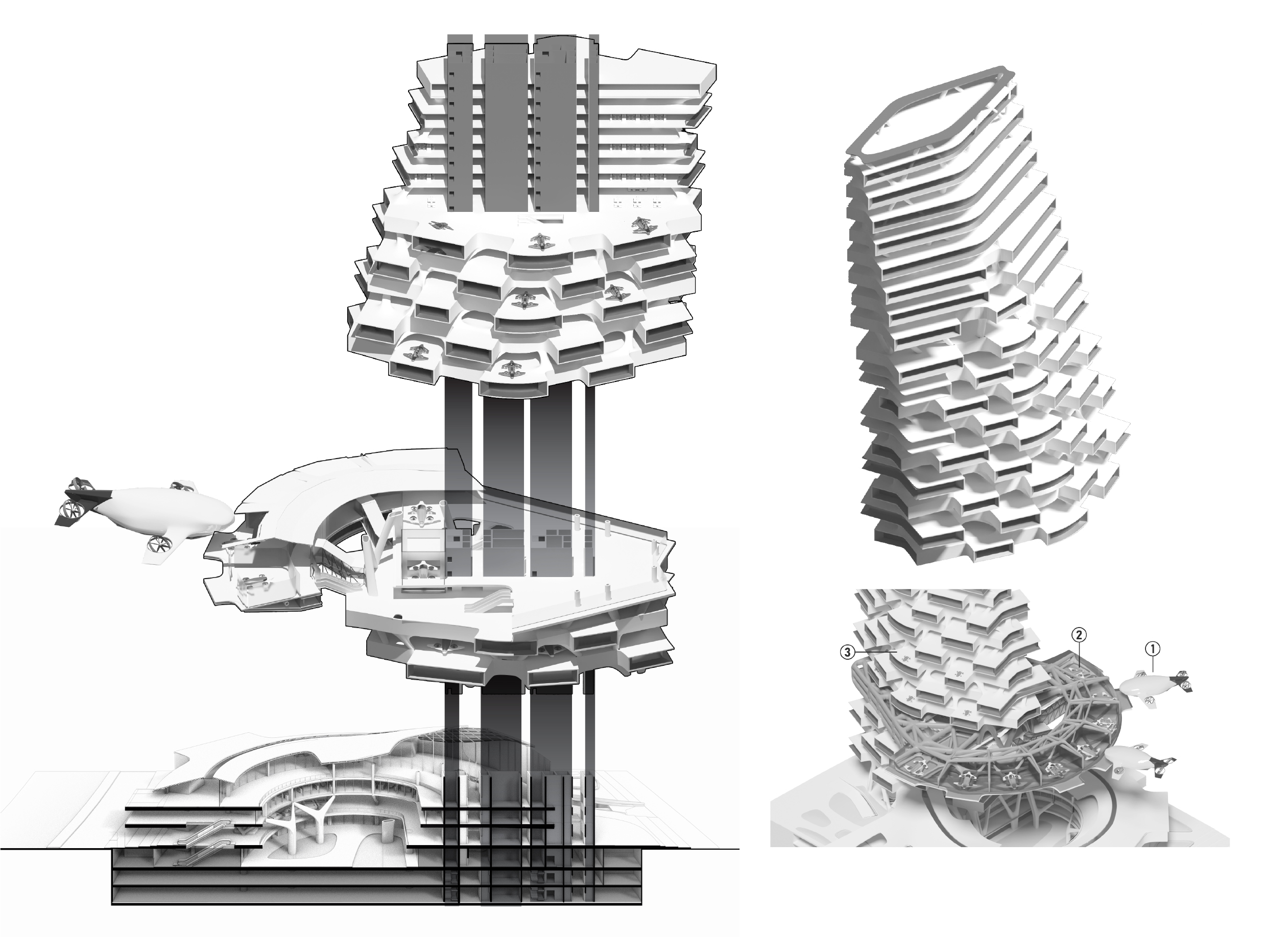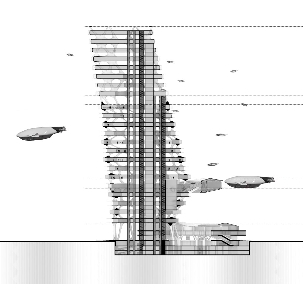In this speculative scenario, integrating airborne vehicles into buildings affects circulation, spatial arrangement, structural systems, and overall form. The movement characteristics of airborne transport add a new dimension to high-rise buildings. Spatial organization is redefined, breaking free from conventional entry points. The final design presents an innovative and creative response to technological advancements in transportation, envisioning architecture that adapts to the urban context of the future.