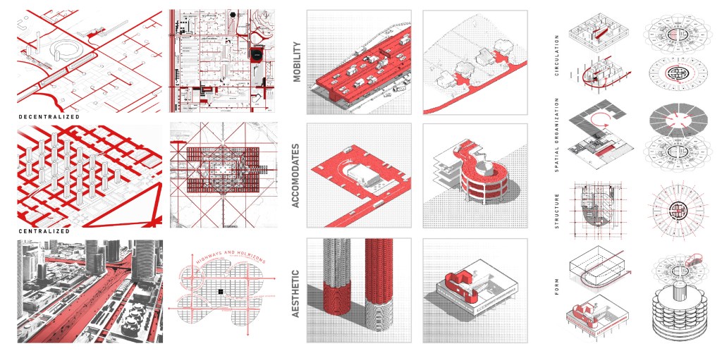Same goes for the architectural level. Transport first impacts circulation—how people approach, enter, and move through a building. These considerations shape spatial organization, dictating the structural framework needed to accommodate the spaces. Ultimately, this process influences the building’s overall form, as architecture responds to the flow of transportation and the way people interact with it.