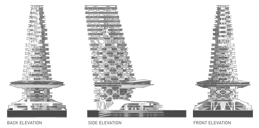 The building mass transitions from a circular base to a diamond shape, optimizing the flight radius for airborne vehicles operating on the decks. As the floors ascend, they gradually decrease in size to reduce structural load. The building leans forward to maximize air clearance above the cantilevered skyport, while the core remains upright to anchor the structure. An octagonal structural pattern adapts to this tilt, creating an organic form reminiscent of a beehive.