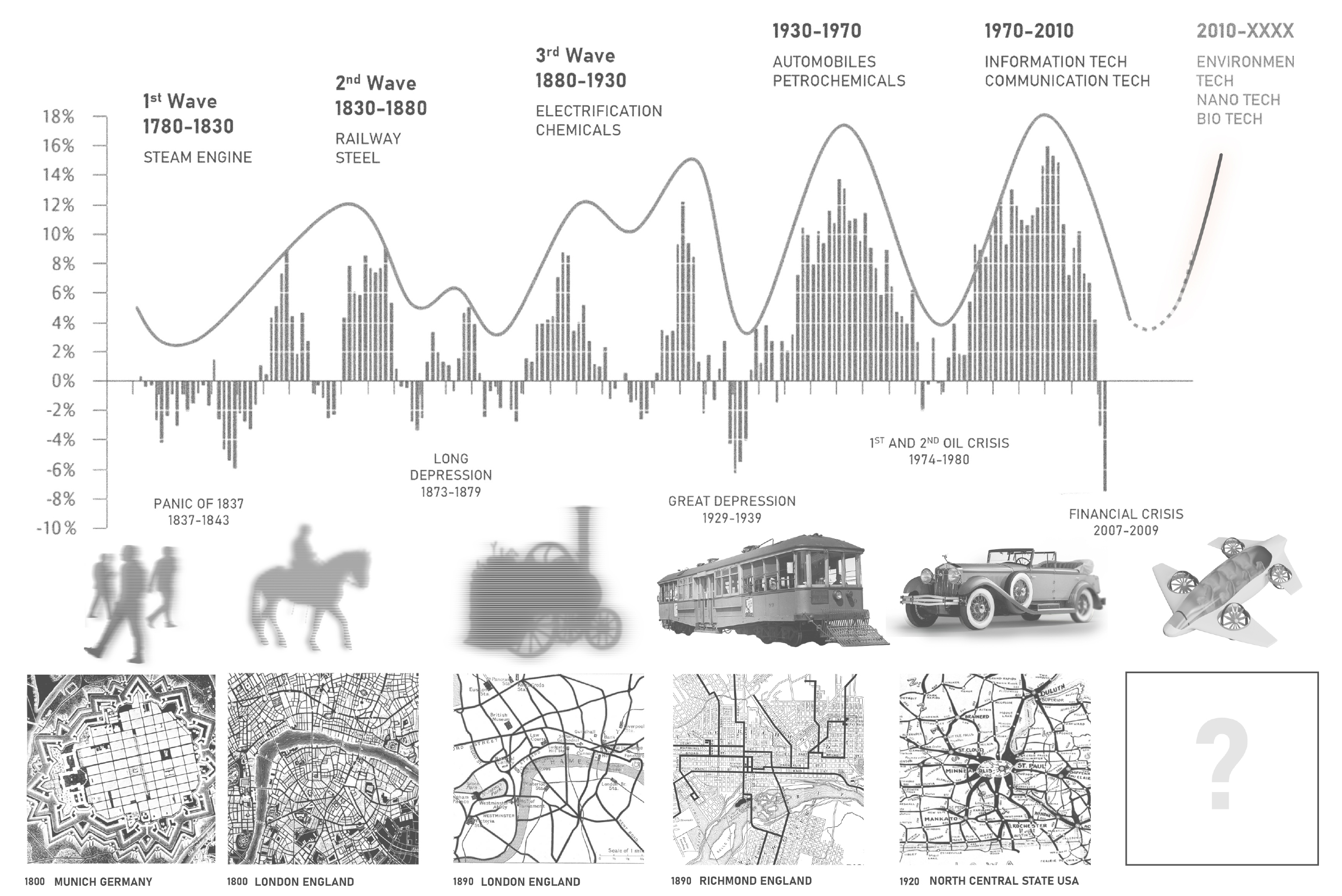 Historically, the shape of cities worldwide can be analyzed in parallel with transportation developments. When walking was the primary mode of movement, cities were highly dense, with all functions tightly packed together. The same applied during the era of horses and carriages, though streets began to widen to accommodate them. The advent of machines and locomotives connected distant cities, leading to urban growth concentrated around train stations, where goods and trade flourished. However, with the rise of automobiles—facilitating individual freedom of movement—cities became significantly more dispersed, shaping modern urban sprawl.