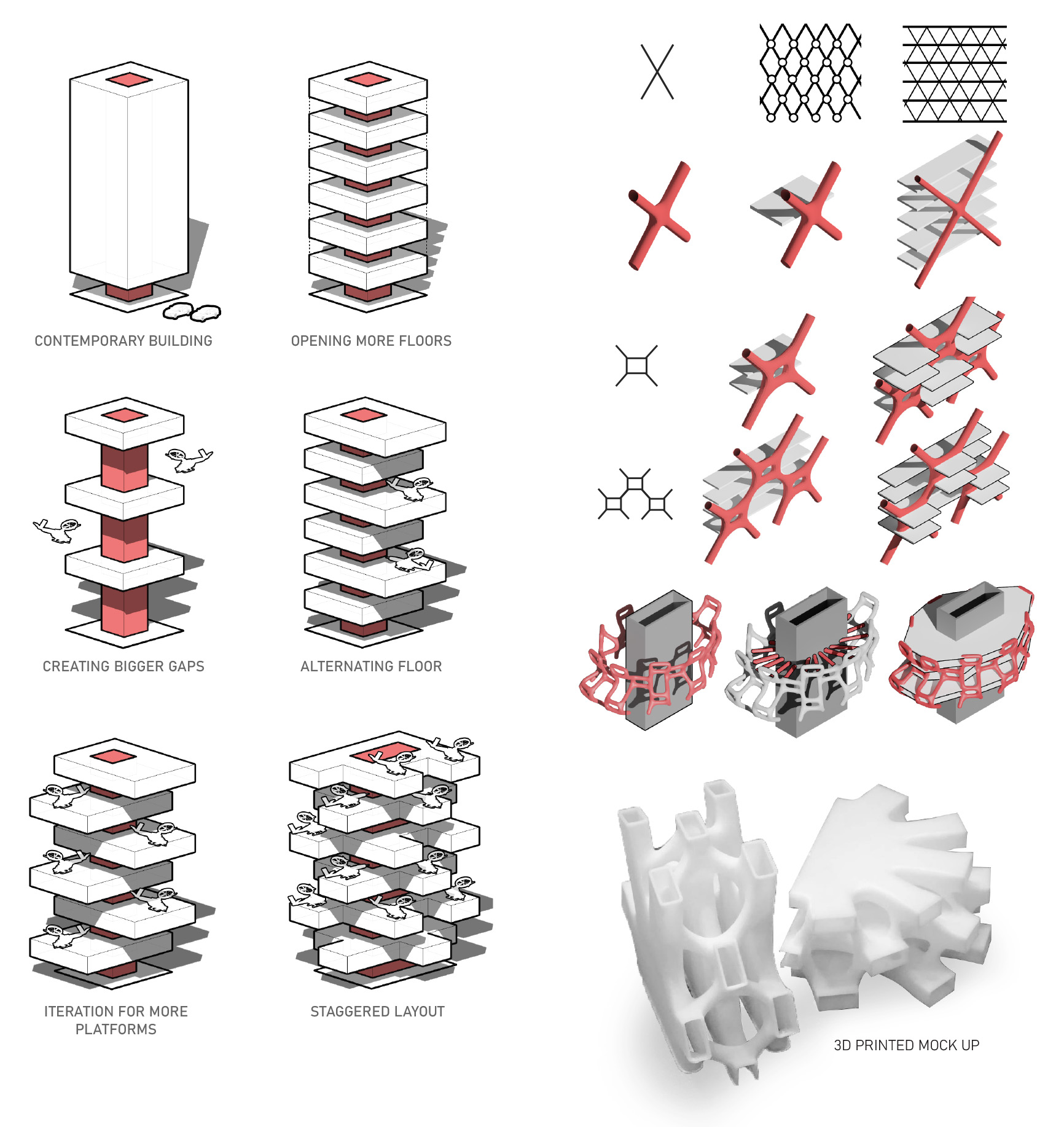 The spatial organization exploration starts with a conventional skyscraper form. To introduce access to outdoor spaces, alternating floors are opened up. These gaps are then expanded to create larger vertical spaces. The open floors are extended outward in a staggered manner, and the structure is further refined to maximize platform layout efficiency.