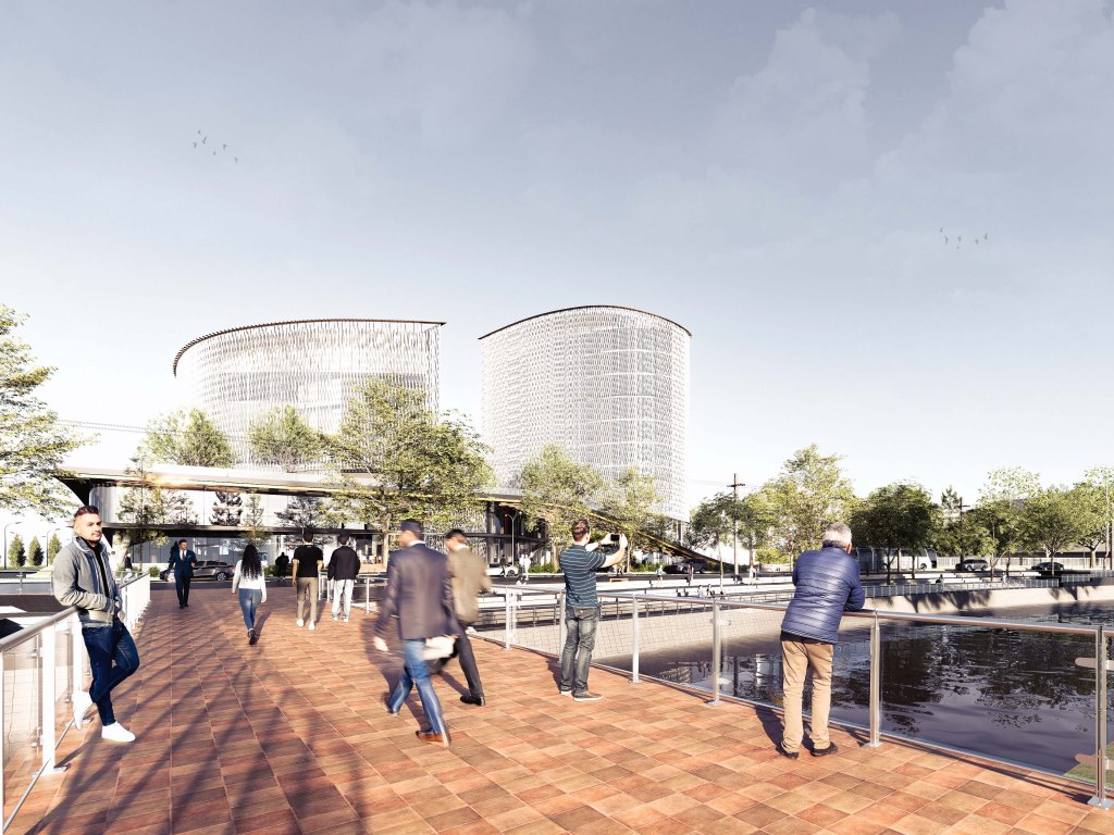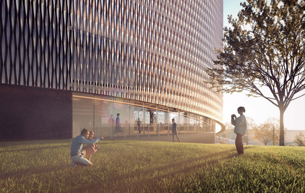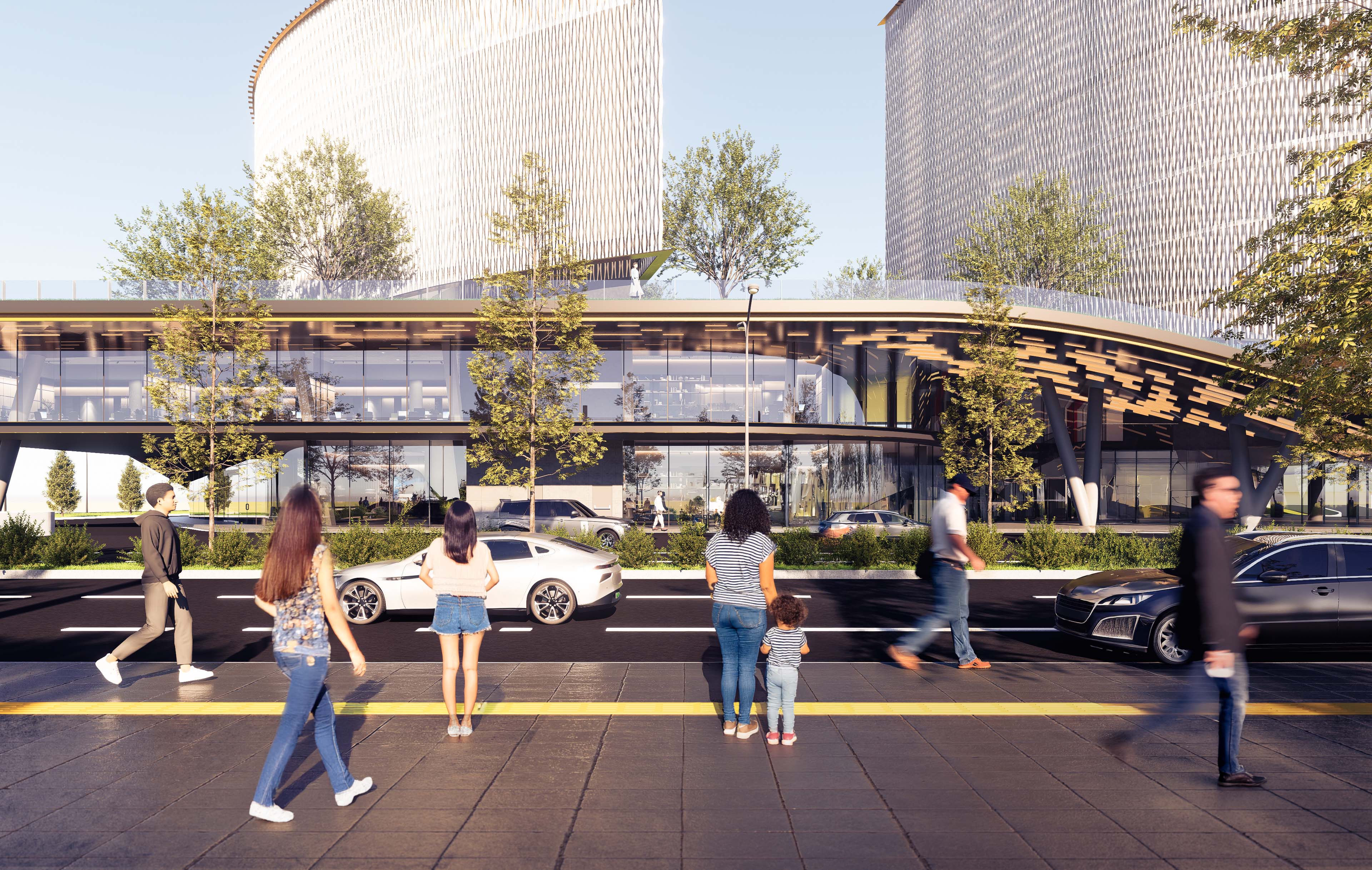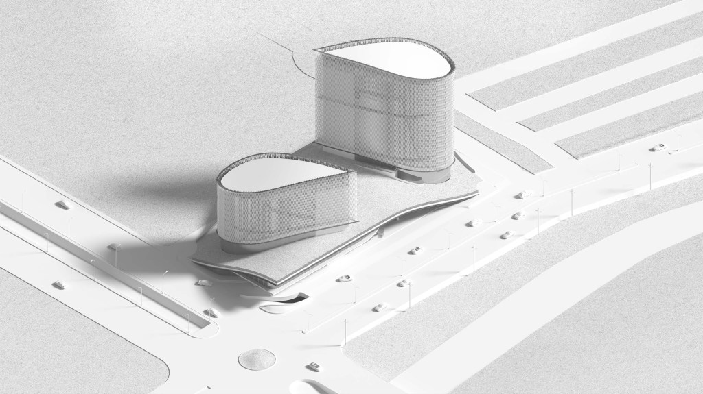The office buildings are divided into two masses: the west and east buildings. Each can accommodate offices of different sizes. The buildings are enveloped by small, tall turbines, designed in response to the plentiful wind in the area. While large turbines would be neither economical nor effective at the building’s height, smaller turbines—strategically positioned and supported by the building’s form—can harness slower yet abundant winds more efficiently.