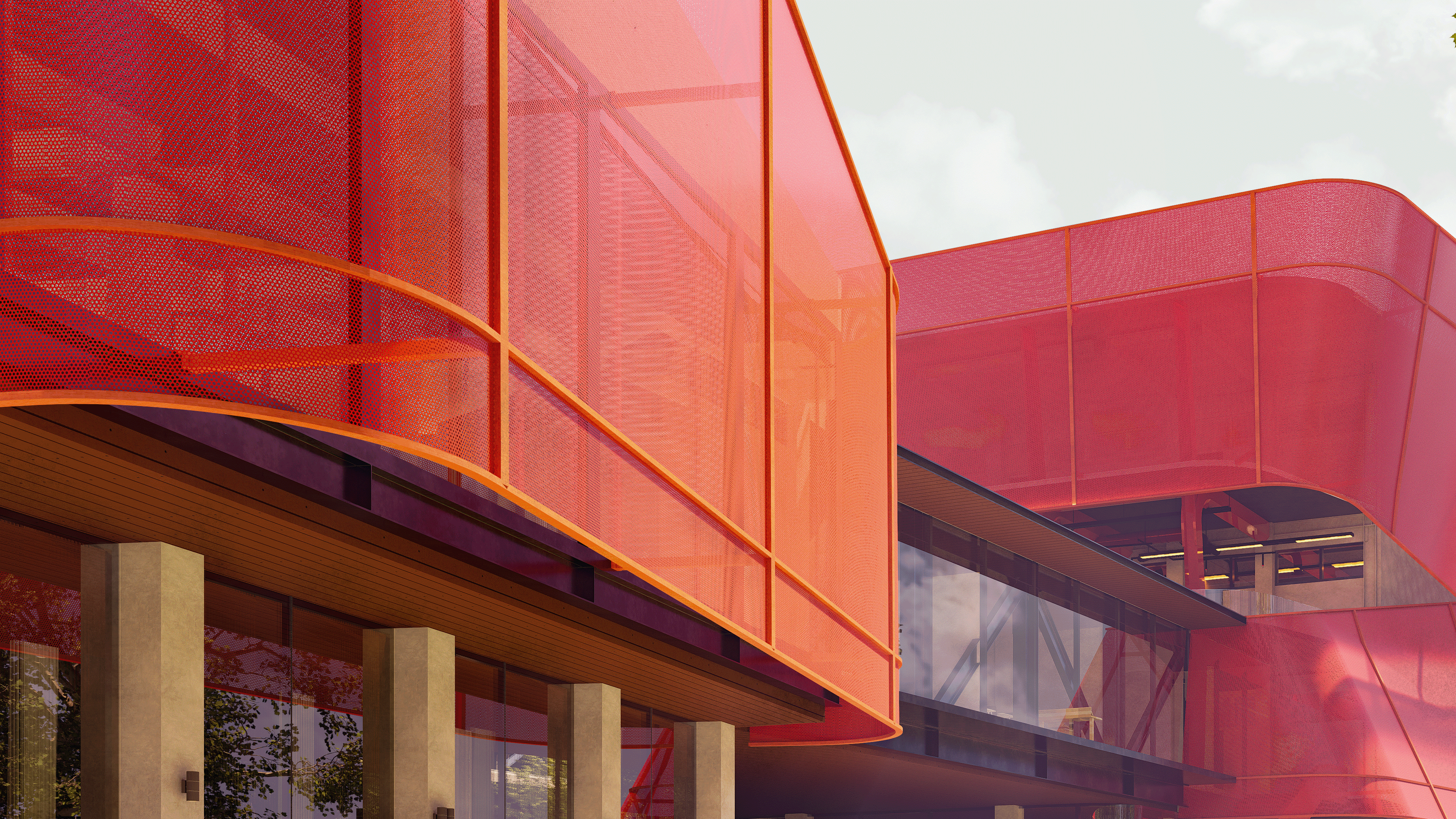 The façade features red perforated metal, inspired by the national uniform of Indonesian elementary students. This material choice helps shield the interiors from excessive noise and direct sunlight while still allowing for natural ventilation. The façade establishes the building’s distinctive aesthetic while enhancing environmental comfort.