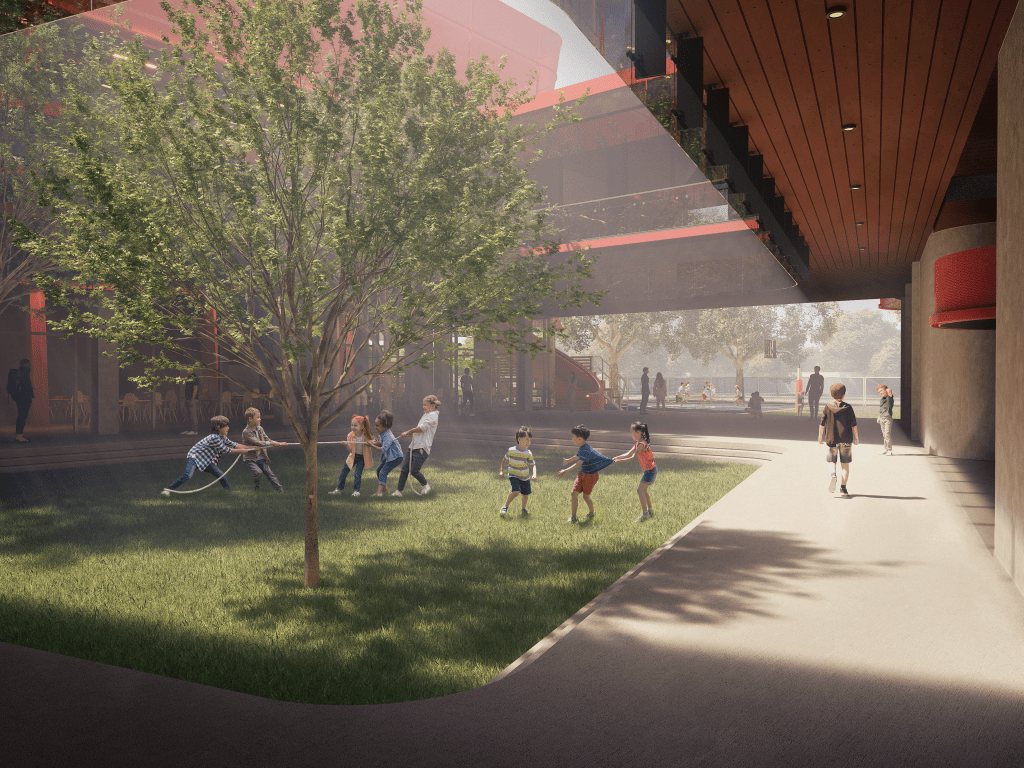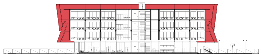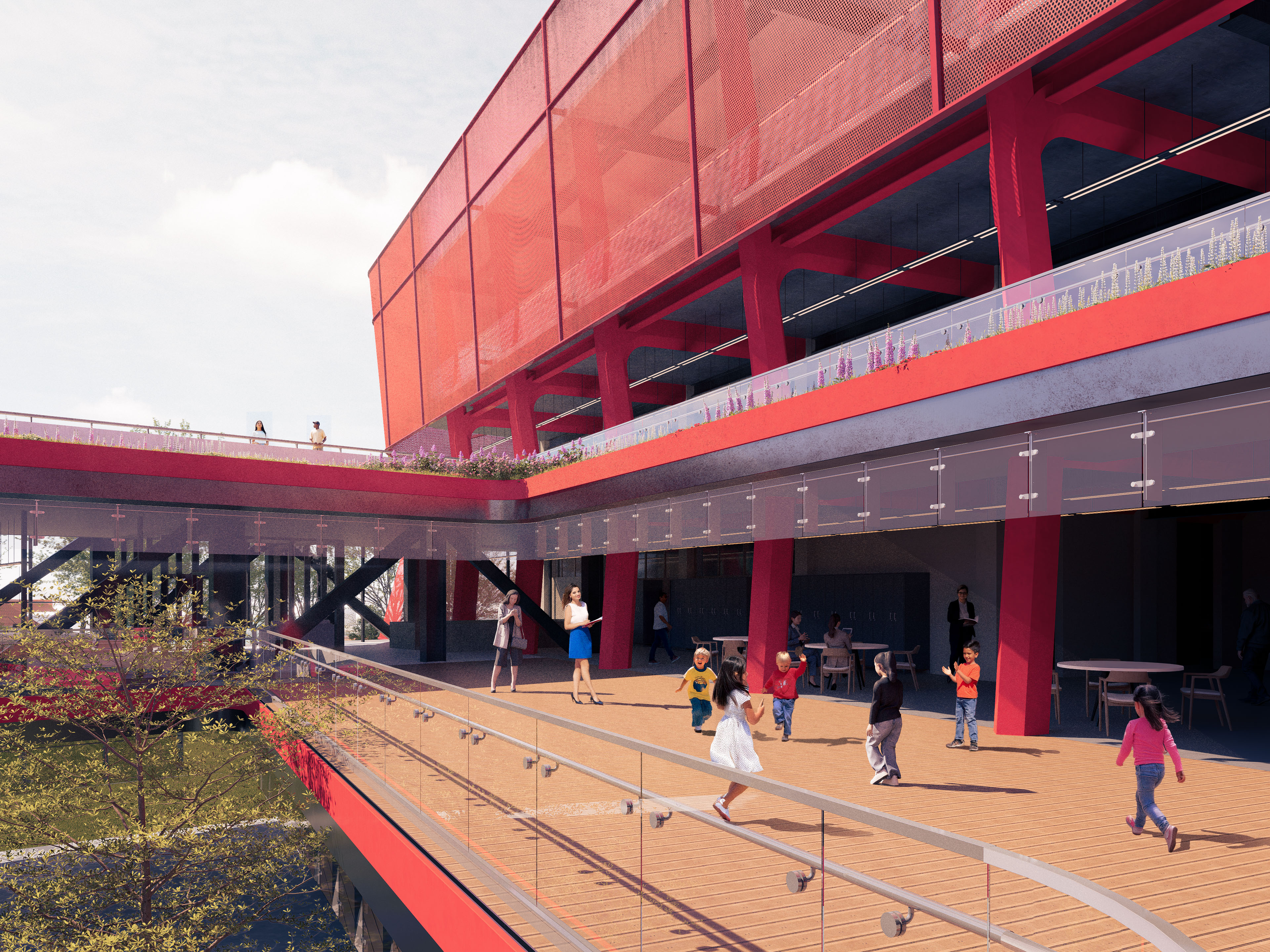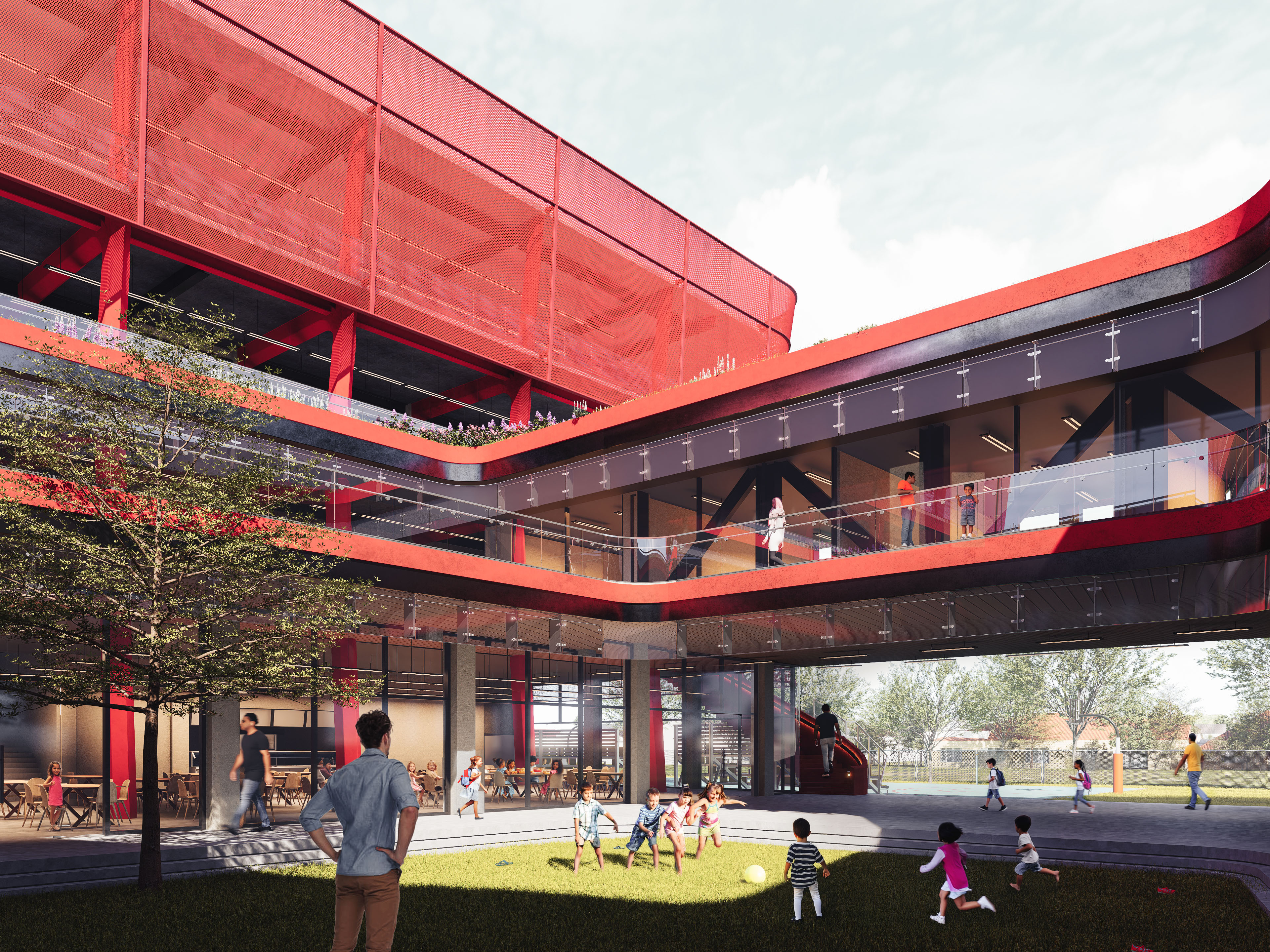 Rather than dominating open spaces, the architecture is designed to enhance them. Glass openings on the ground floor promote transparency and connectivity, while the vibrant red color complements the playful nature of the open spaces.