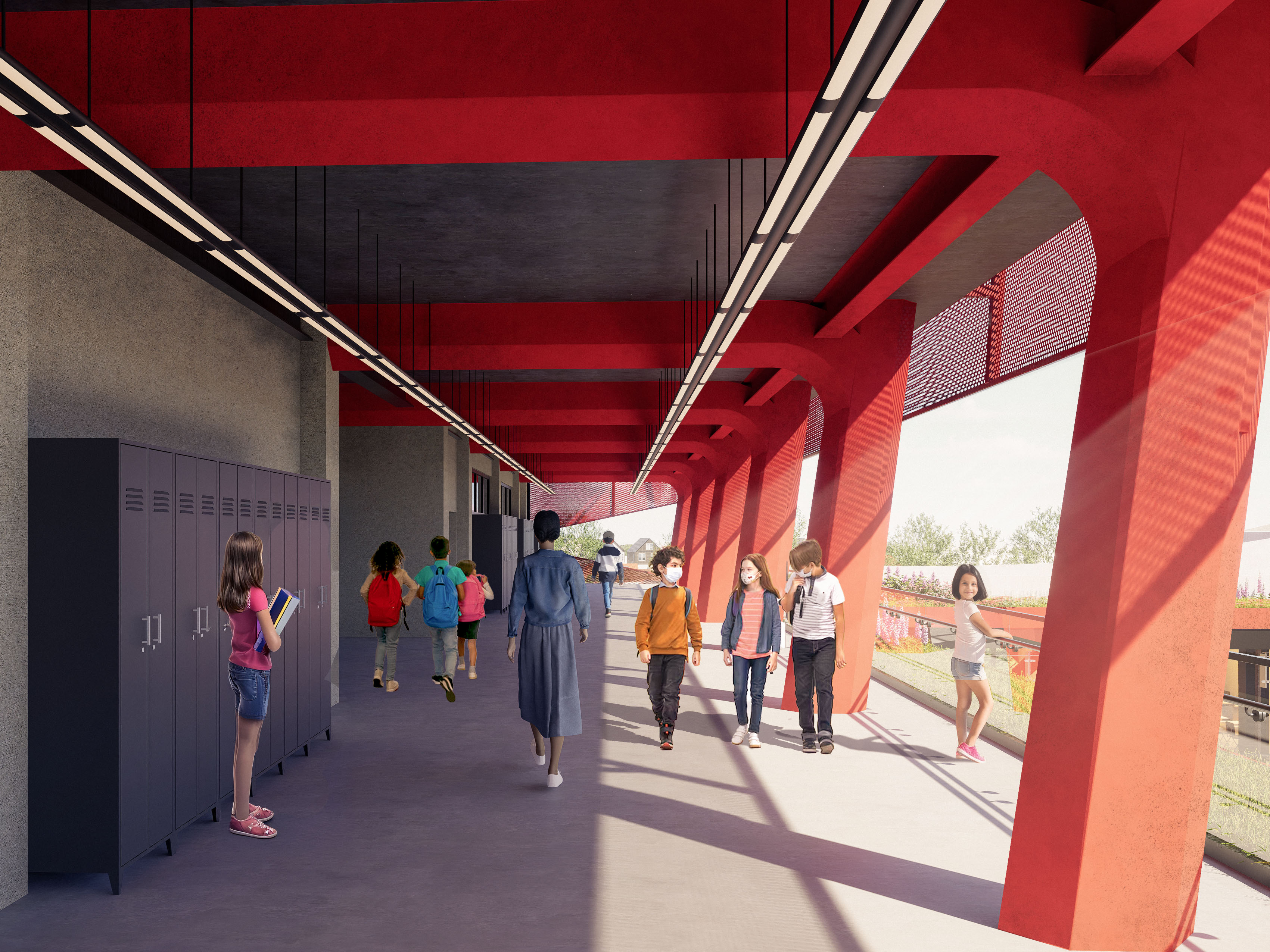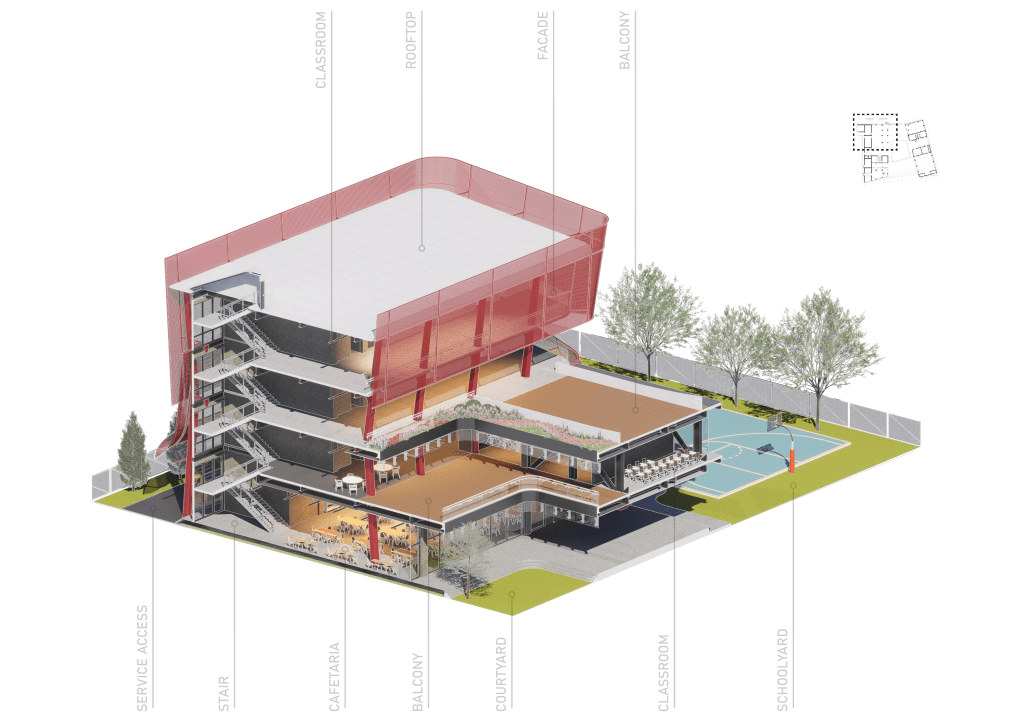 Despite its multi-level design, the school remains an open and explorative space for students. Each level is designed with ample circulation and openings, allowing students to move freely and discover their environment. Corridors are semi-open and oriented toward the courtyard, creating a less restrictive atmosphere compared to traditional schools. The regular placement of columns provides a structured sense of order, maintaining balance between openness and discipline.
