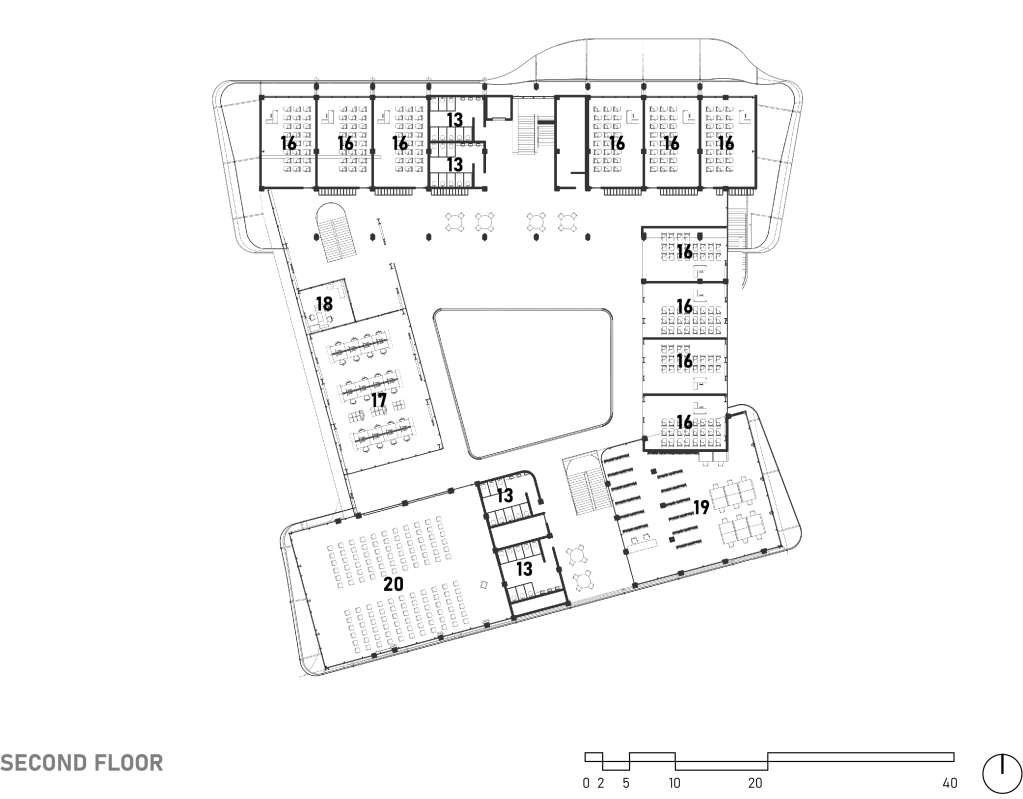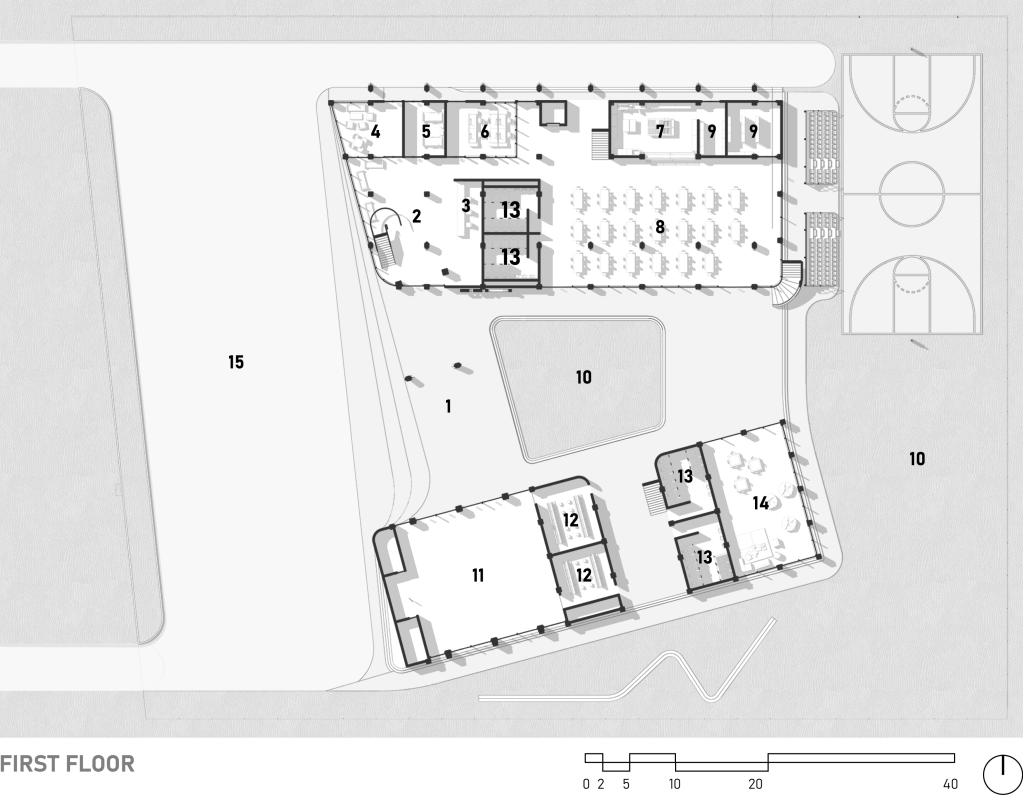 The spatial organization is carefully designed both vertically and horizontally to create an optimal learning experience. Upon arrival, students are greeted by an open courtyard, which helps them feel at ease and reduces any anxiety about attending school. Classrooms are located on the second floor and above, distancing them from street noise, while the centrally positioned teacher’s area provides a clear vantage point to oversee the entire school. Communal spaces are grouped together to encourage interaction and engagement.