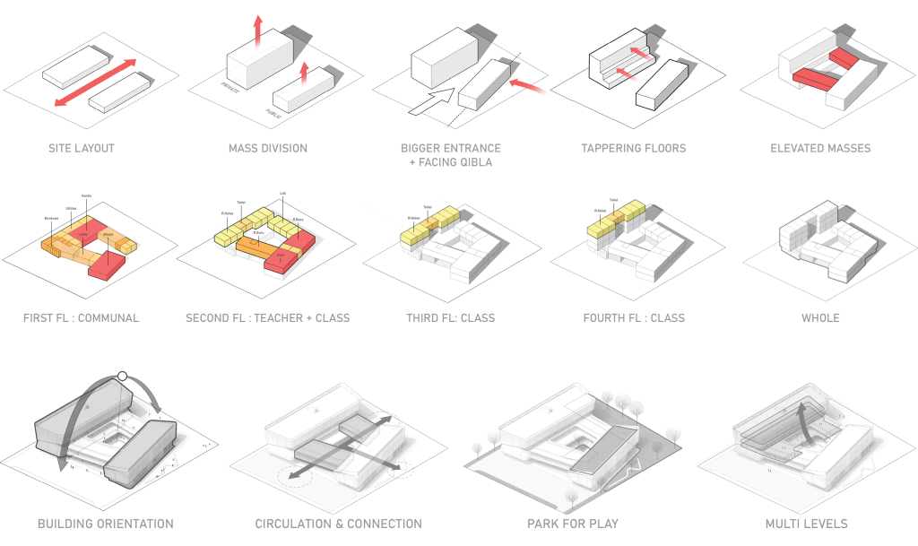 The school comprises two primary and two secondary buildings, strategically arranged to optimize functionality and environmental performance. The taller main building, oriented east-west, minimizes heat gain and houses private classrooms. The second building, positioned to align the mosque with the Qibla, accommodates communal spaces and serves as a visual and acoustic barrier for the garden. Additionally, an elevated mass connects the two main buildings, forming bridges that house teachers’ rooms and labs, ensuring visual access and connectivity across all areas.