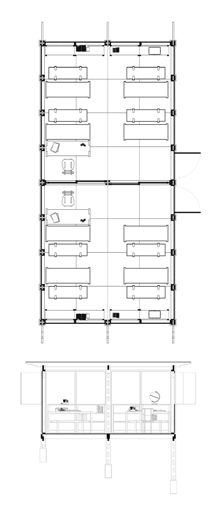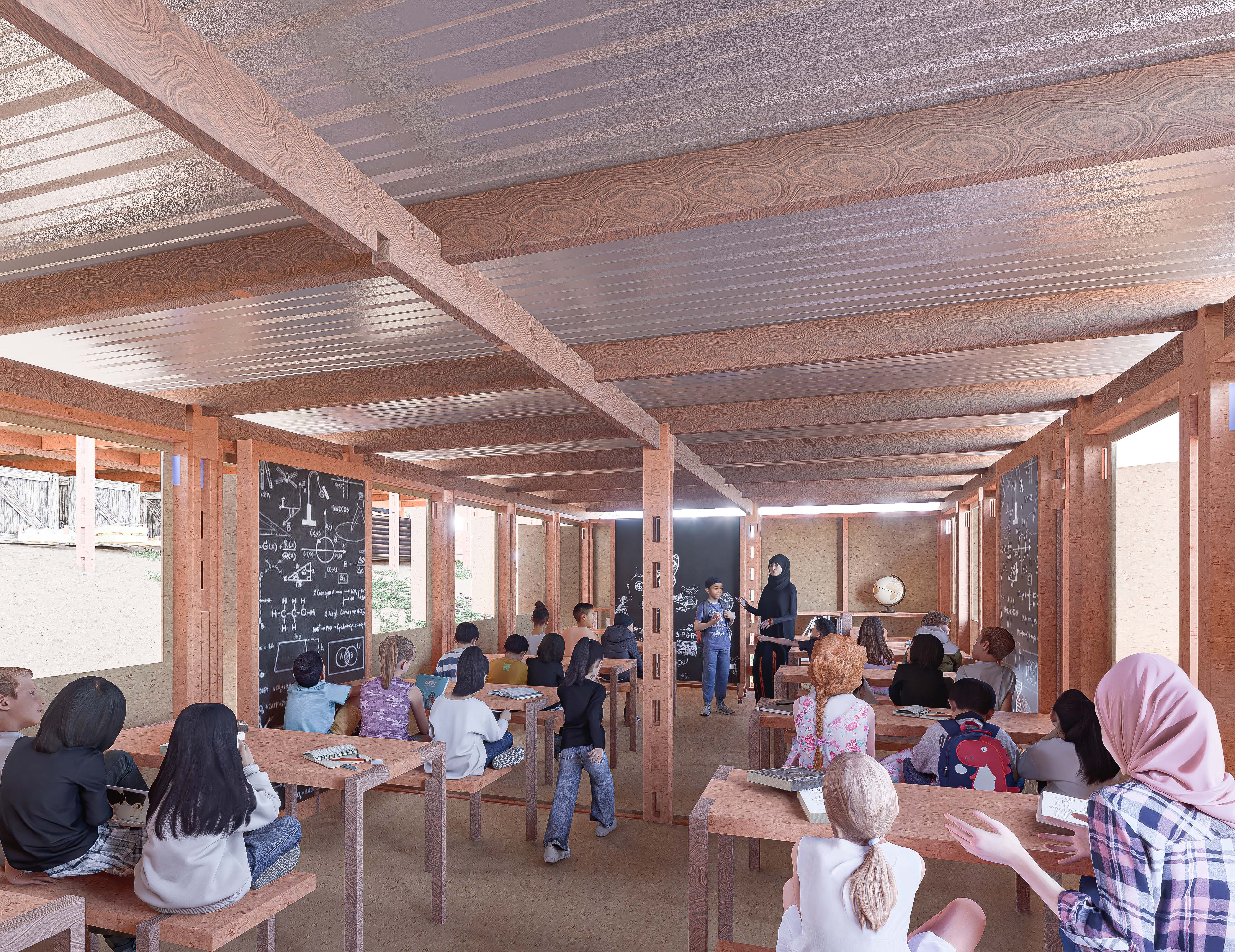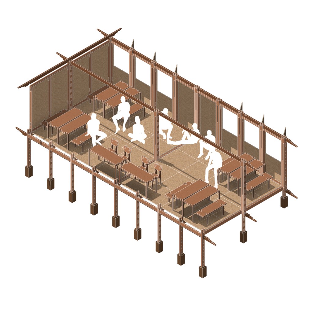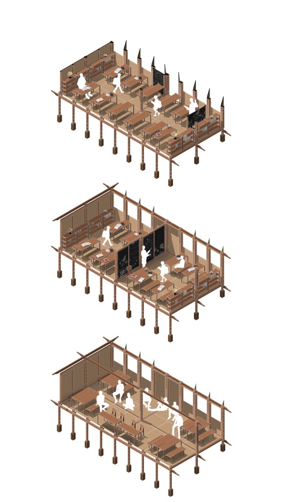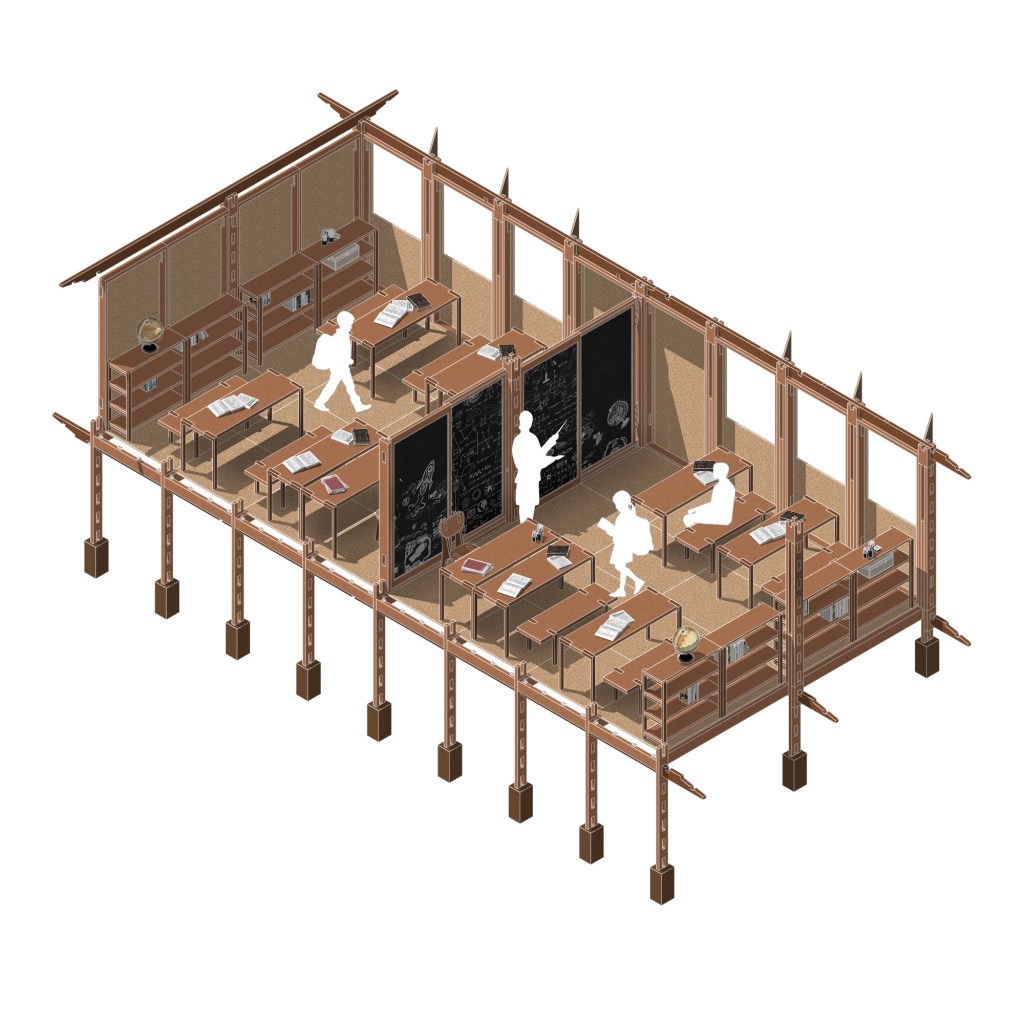 Spaces underneath the classroom could be used as storage or other useful functions such us for water containers collecting rain water, for temporary shelter to sleep in case of emergency, to grow small animals like chicken (depends on the function in the interior above) or to grow vegetables in hydroponic methods.
