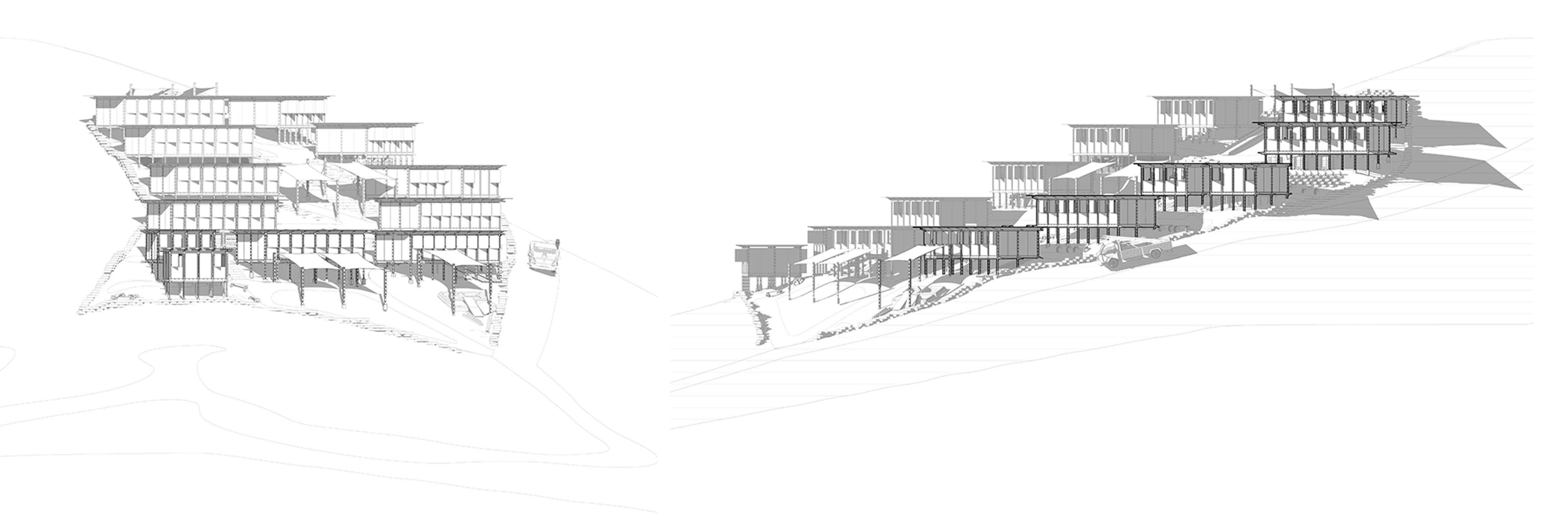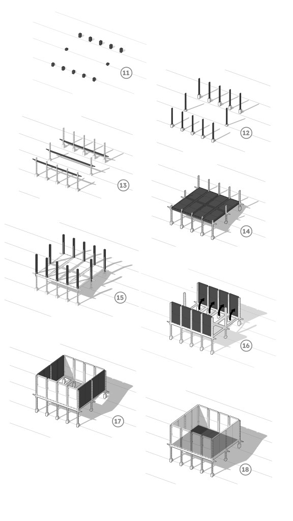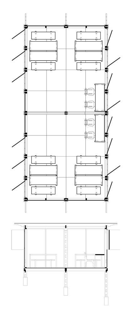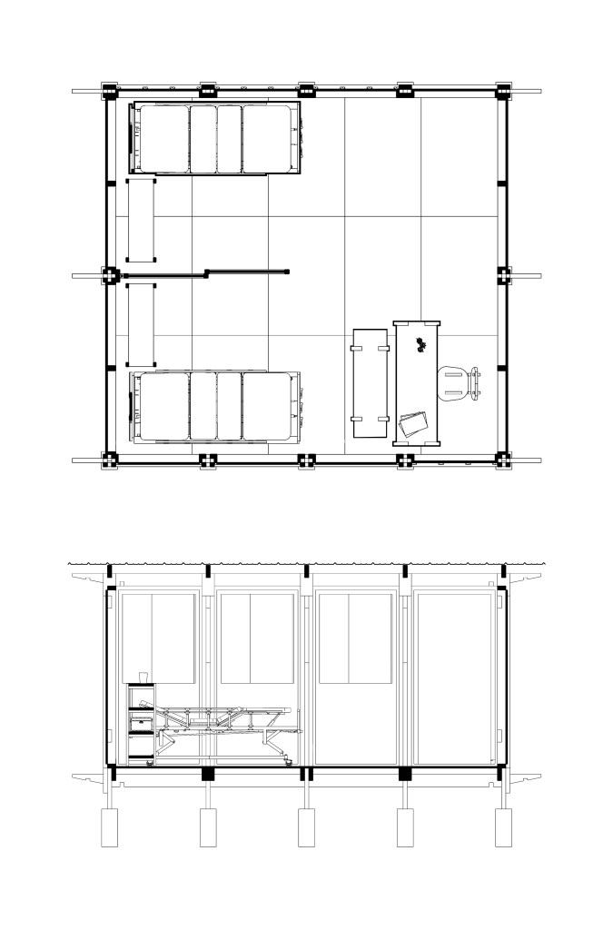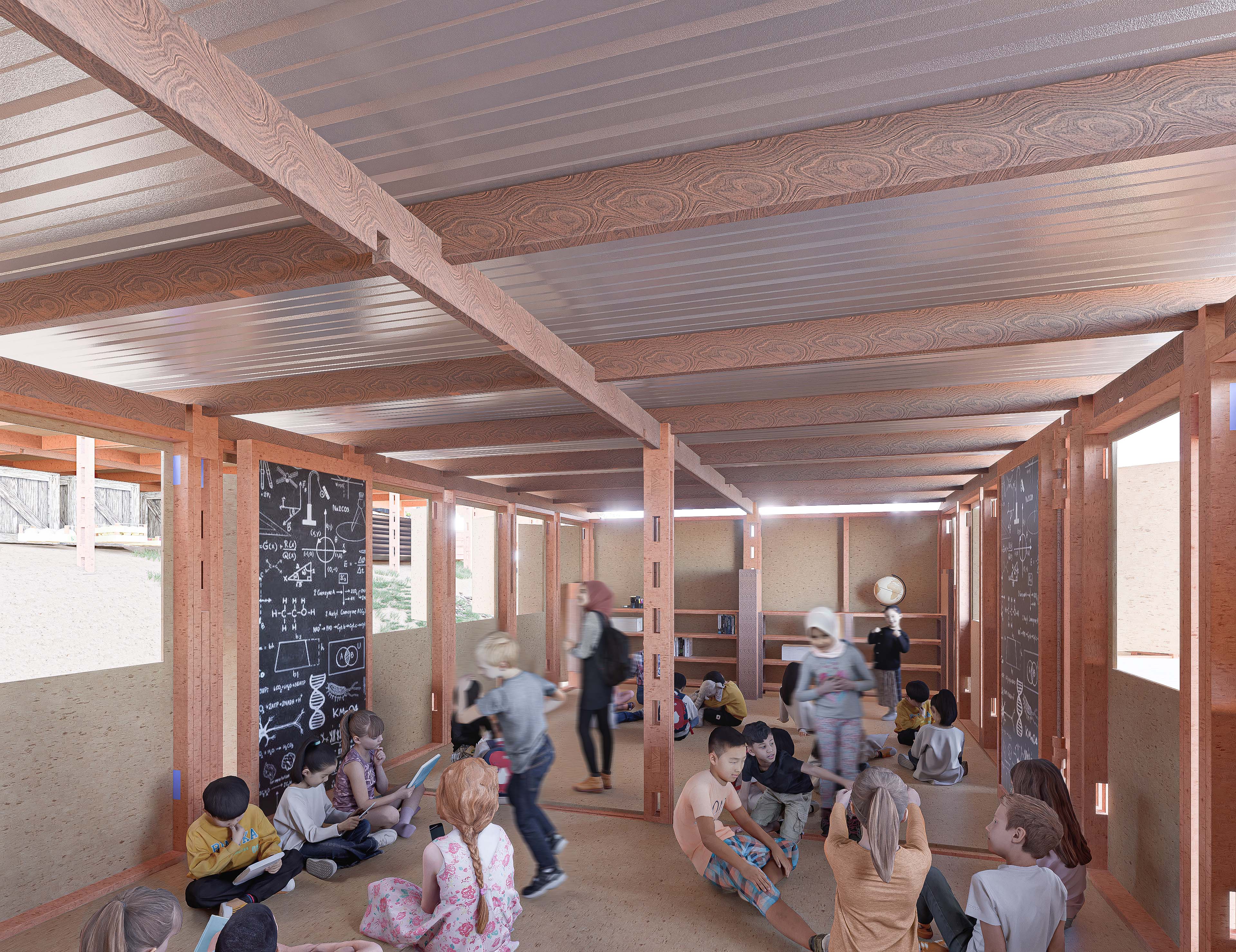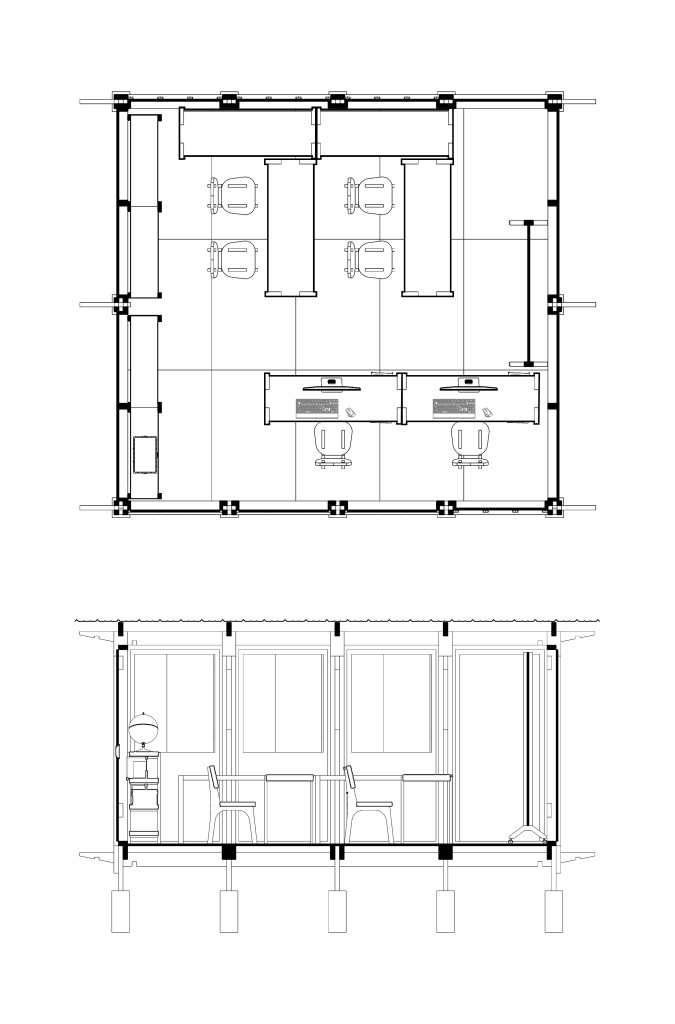 Spaces underneath the classroom could be used as storage or other useful functions such us for water containers collecting rain water, for temporary shelter to sleep in case of emergency, to grow small animals like chicken (depends on the function in the interior above) or to grow vegetables in hydroponic methods.