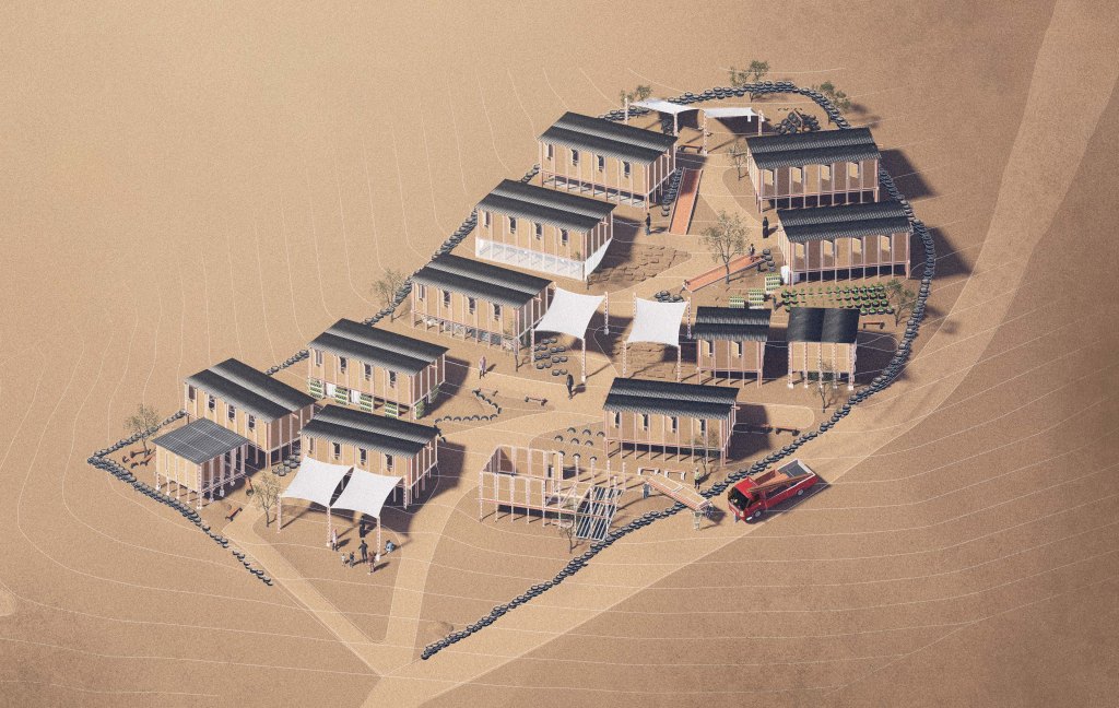 The project site is located in Khan al-Ahmar village, Palestine, on a hillside overlooking the community. One of the main challenges was working with the site’s natural contours, which we embraced by designing a layout that follows the terrain. Although all building masses share a similar form due to their modular construction, the interior spaces are designed to be flexible and adaptable. The school consists of five primary functions: classrooms, a multipurpose hall, a teachers’ room, a medical room, and toilets. Classrooms are spread throughout the site, while the centrally placed teachers’ room allows for effective supervision and quick emergency response. To support both the school and the surrounding community, the multipurpose hall and medical room are positioned at the base of the site, providing easy access for local residents as well as students