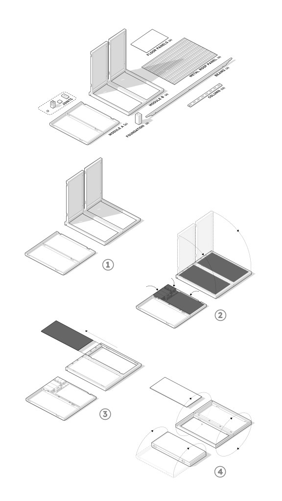 The use of foldable furniture ensure the flexibility of the interior spaces. The folded furniture can be stowed inside the class or underneath the class. These furniture is also will be able to be transported inside the folded modules of wall and floor panels.