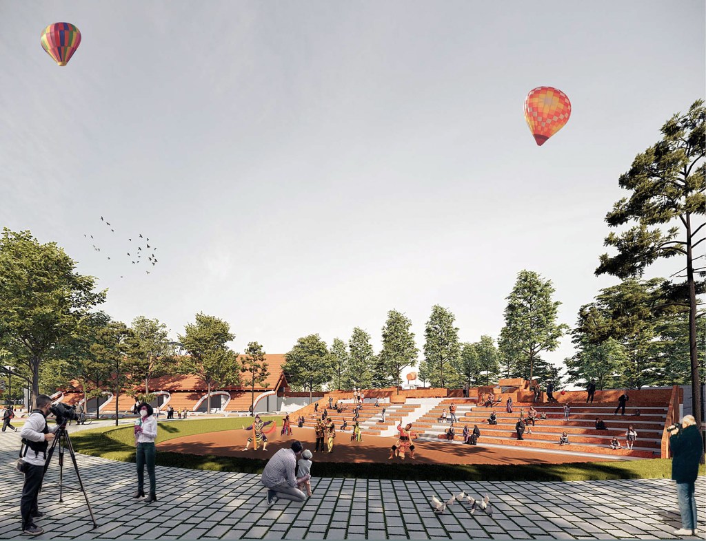 This is an outdoor amphitheater designed to be multifunctional, with a primary focus on hosting ludruk performances. Instead of constructing a closed building, we chose to expose the ludruk stage to bring it closer to visitors. The amphitheater is open and seamlessly connected to nearby amenities through the back of the seating area. This allows both seated audiences and passersby to enjoy the performance, creating a more inclusive and accessible cultural experience.