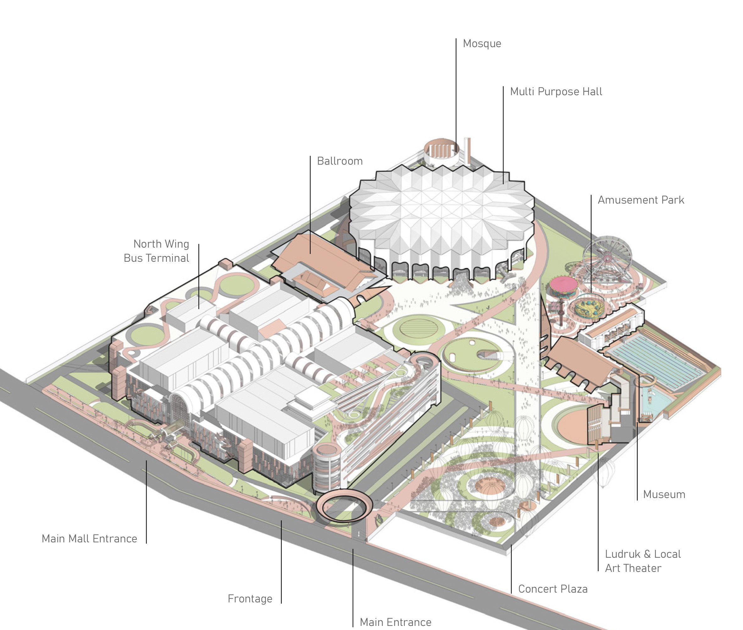 The main vista and pathway leading to the MICE building is designed to follow the unique shape of the site. We aimed to keep the open areas as unobstructed as possible, carefully positioning each building to minimize visual and physical interference. This approach ensures clear sightlines and easy accessibility throughout the masterplan.